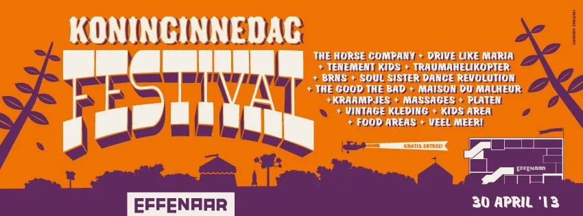 De Effenaar in Eindhoven pakt traditioneel twee dagen uit. Tijdens Koninginnenacht is het feesten met Superstijl en in de kleine (Cortonville) zaal rocken met Wallace Vanborn, John Coffey en Raketkanon. Op Koninginnedag gaat het er echt vol (en gratis) op met o.a. Traumahelikopter, Tenement Kids, Drive Like Maria, The Horse Company en Maison Du Malheur.