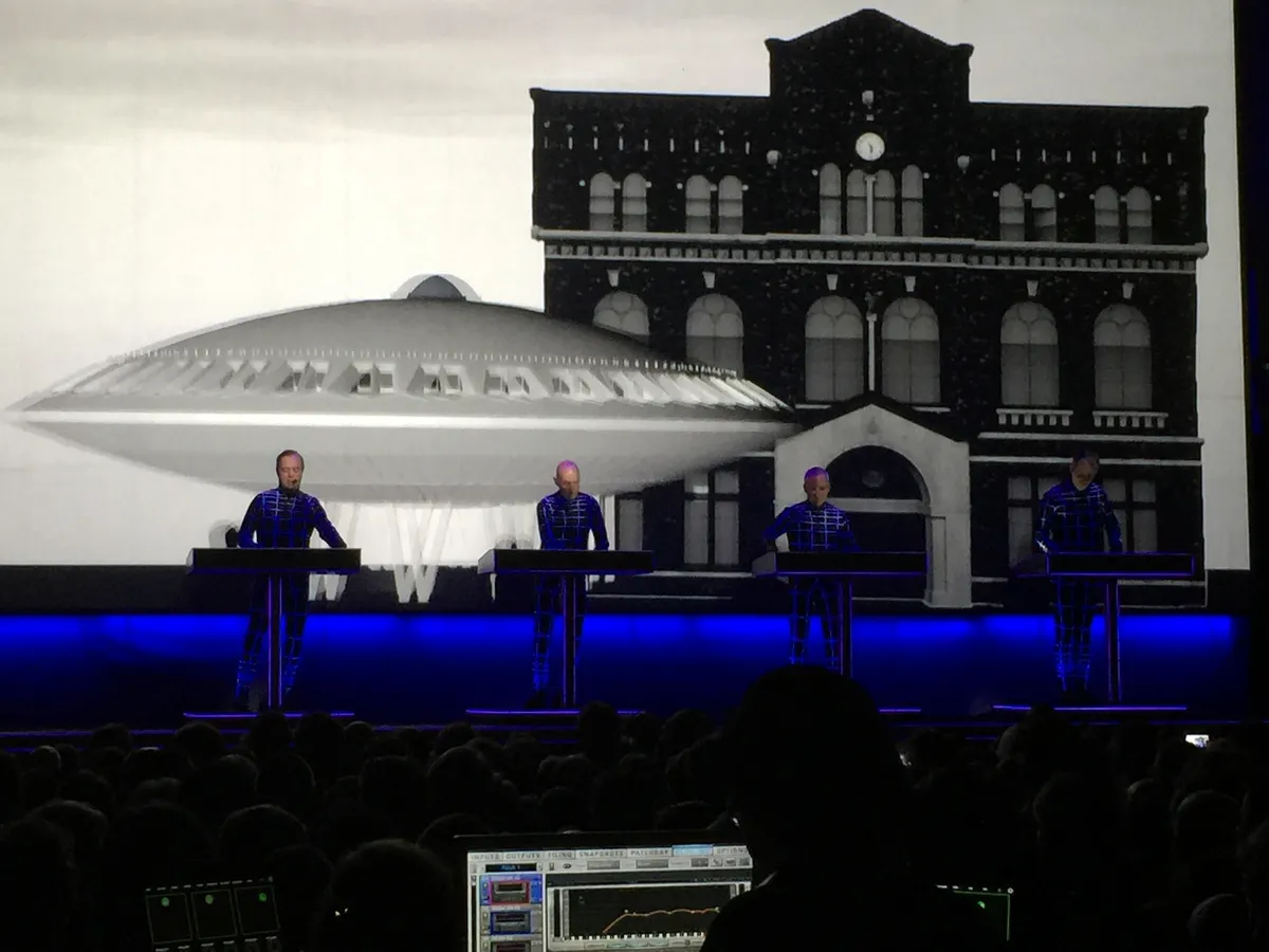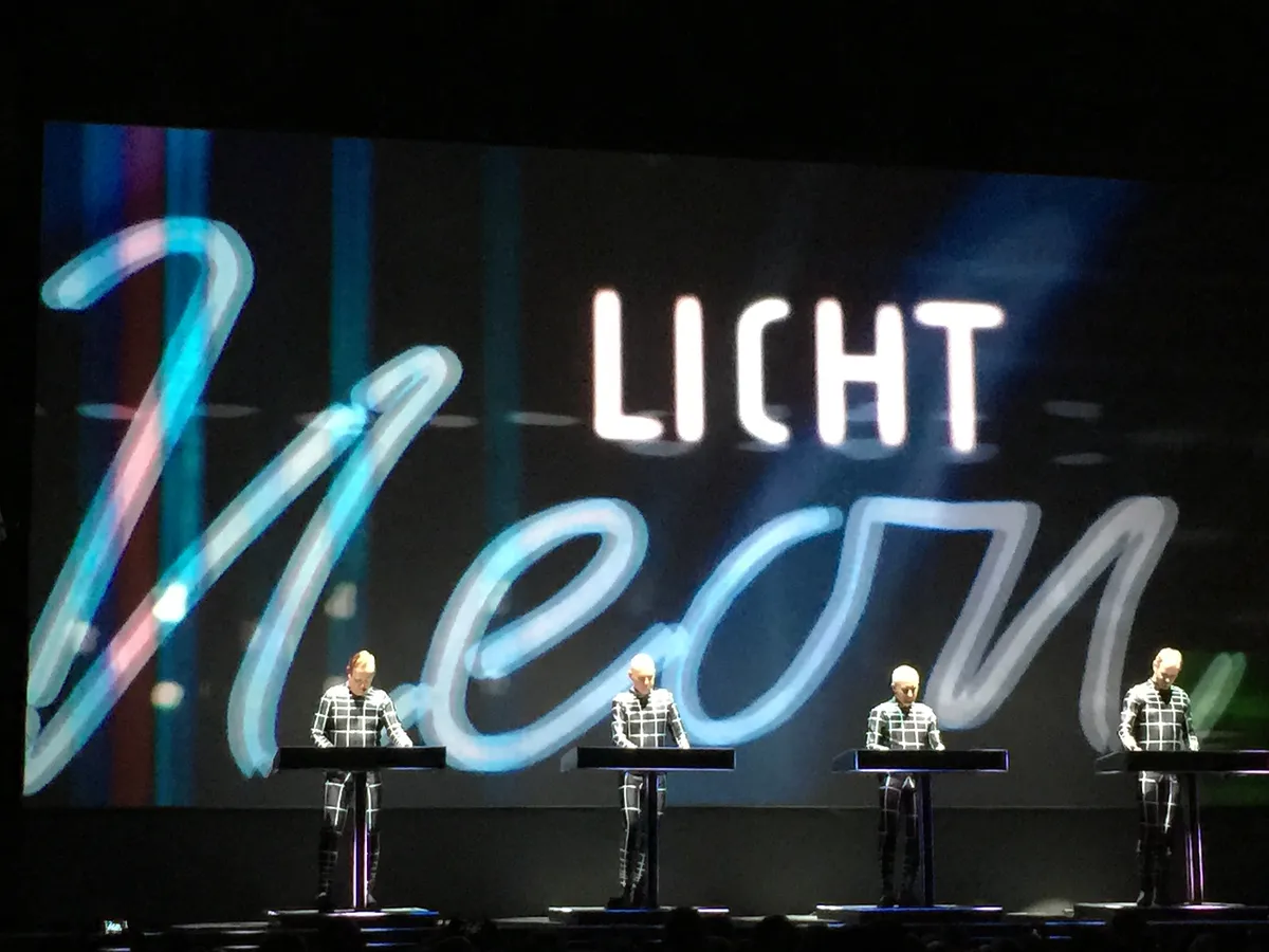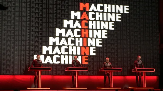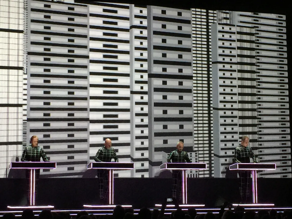 Die typografie, die 3D figuren naar Lissitzky steken Paradiso in tijdens The Man Machine. Spacelab volgt, waarbij het Evoluon op scherm vóór en in je gefopte hersens ín Paradiso landt. The Model, gecoverd door velen, waaronder Rammstein en Steve Albini’s Big Black. Neon Light, weemoedig verlangen naar nachtelijk eenzaamheid. En, voor het eerst deze week, in een prachtige uitvoering, Metropolis. Met sterke zang van Hütter die vanavond sowieso goed bij stem is. En, als eerste toegift, zoals elke avond, onder loeiend joelen van het publiek, The Robots. Met op het podium de als robots bewegende evenbeelden van Hütter, Henning Schmitz, Fritz Hilpert en Falk Grieffenhagen.