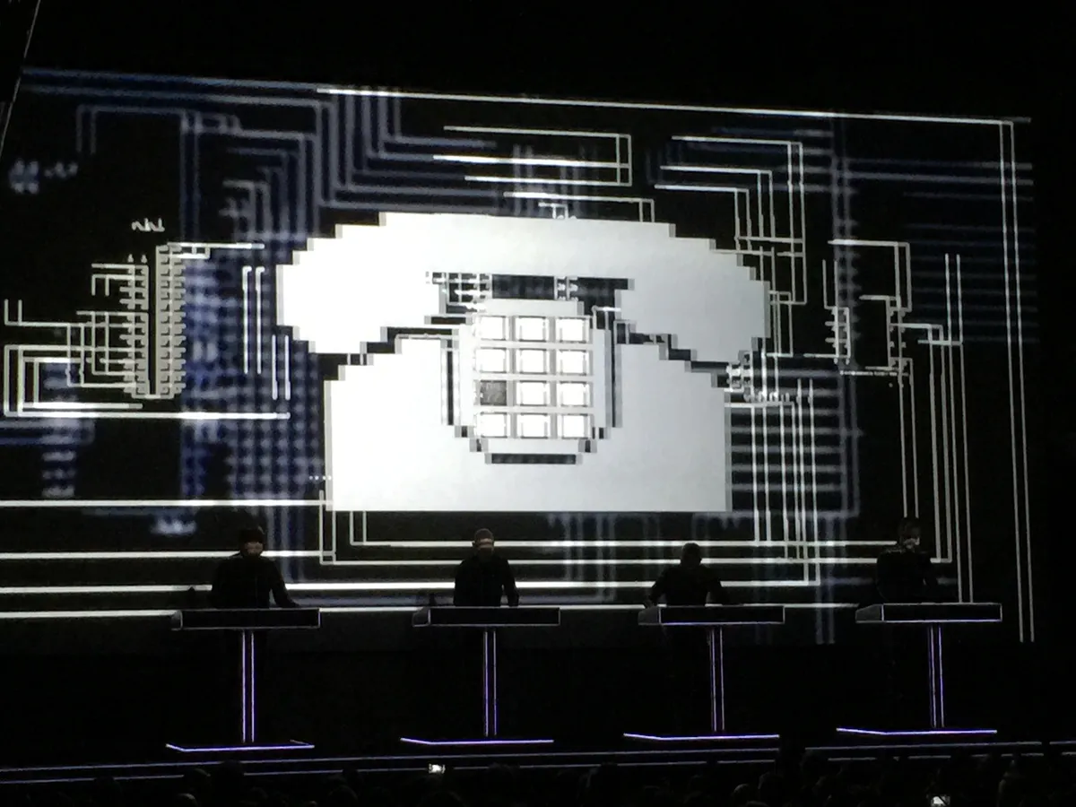 De schoonheid drong tot me door op het moment dat de Greatest Hits weer een aanvang namen met Radio-Activity. Om het moment dat de strakke bassequencer begon, die zoveel beter klonk dan gisteren. Het besef werd nog sterker bij het deel in Trans Europe Express waar de trein over de brug dendert. Staal op staal, een waaier van klankleuren in een strakke cadans. De kletterende ketting bij het ritmisch schakelen van de derailleur in Tour de France. Het brommen, piepen, zoemen, tikken, zwiepen, donderen, in toom gehouden door de vierkwarts, de verdeelsleutel van de popmuziek. Schoonheid.