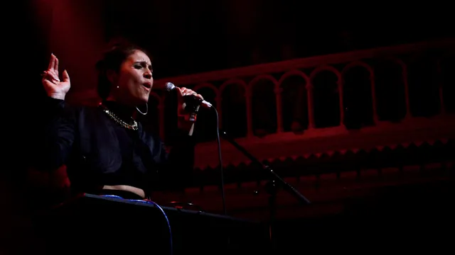 Vanavond is die stem wél in volle glorie te horen, inclusief loepzuivere uithalen en vocale hoogvliegerij. Ze heeft ook de moves van een diva: af en toe fladdert ze met haar handje door de lucht om een uithaal kracht bij te zetten, schudt ze boos nee of hangt ze achterover met haar armen in de lucht.