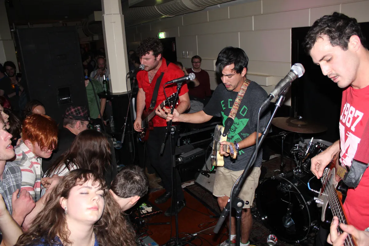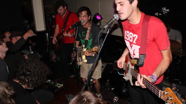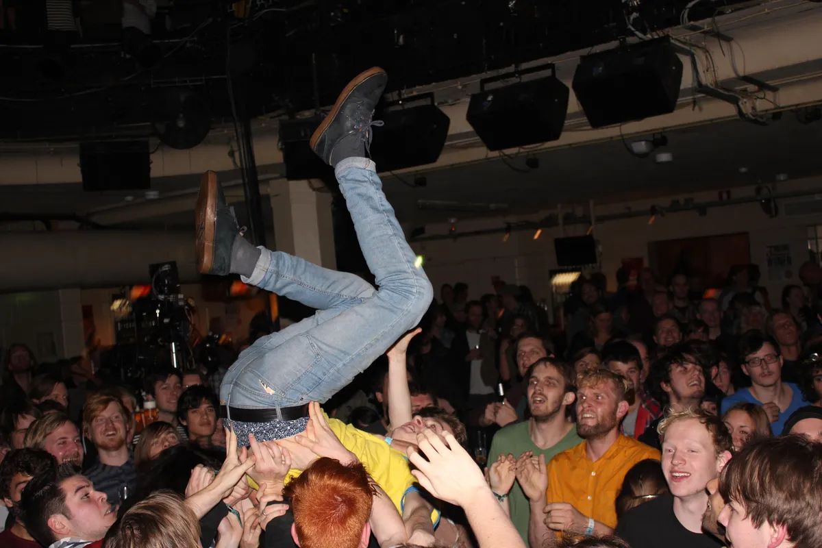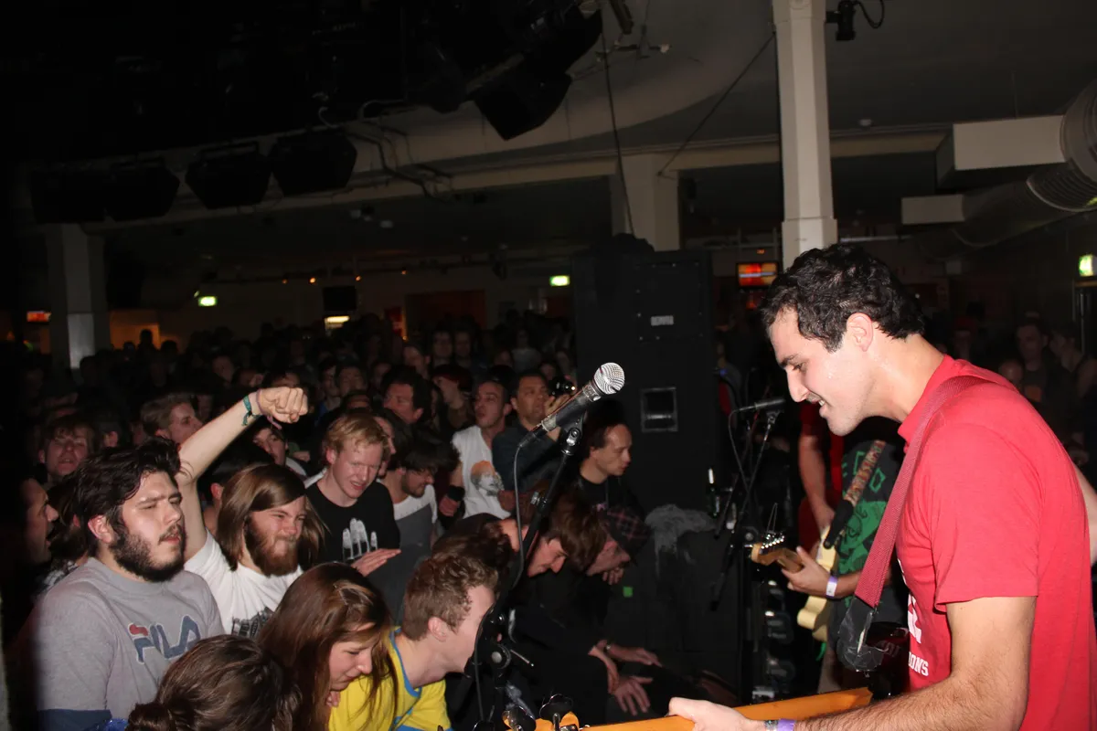 Zanger-gitarist Zac Carper, in broek met afgescheurde pijpen, heeft een speelse, ondeugende grijns, die de hele show niet meer van het bezwete gelaat verdwijnt. Hij zet vrijwel elk nummer in met een verwijzing naar een ander genotsmiddel: "This song is about LSD. Do you have LSD here?" In Cocaine snijden ze ook een voorname Beastie Boys partyfeel aan en Wake Bake Skate behoort tot de felste, meest opruiende nummers. FIDLAR is losjes en rammelend rockend als de vroege The Black Lips maar dan met een dikke glimlach, een nog dikkere knipoog en vooral: on speed. Het kwartet heeft naast tomeloze energie vooral heel veel lol in wat ze doen en dat slaat over als olie op het Fuzzbox-vuur. Wat aanvankelijk als een bescheiden pitje oogt, mondt al gauw uit in een kolkende massa die het centrale deel van de Tivoli-zaal meevoert. De pit is hevig, het publiek slaat in aanvalsgolven tegen het zaalpodium en over de monitoren en een slingerende stellage met boxen moet door drie man gezekerd worden om niet omver te worden gesmeten. Zo'n laag podium heeft veel voordelen: je kunt de band aanraken, het podium bestormen en die opzwepende garagepunk-beleving van dichtbij proeven; het zweet spat je in het gezicht. Crowdsurfen is ook laagdrempelig: de een na de ander komt voorbij en Carper kan zelf natuurlijk niet achterblijven.