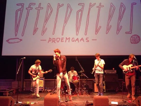 "Proemgaas", zo stond er te lezen boven de hoofden van Afterpartees, toen ze de aftershow van Vampire Weekend speelden in de HMH. De uitdrukking in 't Limburgse dialect betekent zoveel als "vol gas geven". Ja, en Proemgas is de Solex-club te Horst die de vader van zanger Niek Nellen (23) ooit oprichtte. "In het kader van 'Hou het klein, hou het dicht bij jezelf'", lacht Niek. "Maar zelf heb ik geen Solex, en ik mag niet op die van mijn pa rijden, hij vertrouwt me er niet mee."