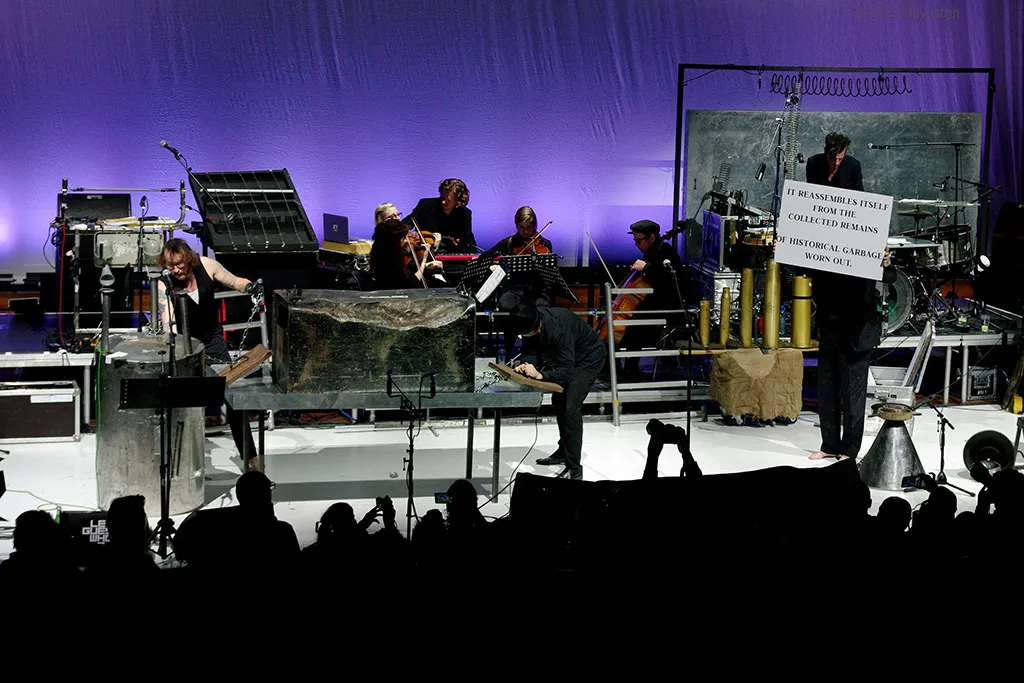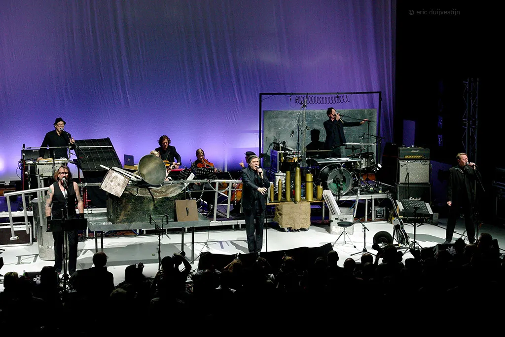 Zoals het een avondvullende voorstelling betaamt, blijven de Neubauten prikkelen. Ontregelen. Verrassen. De vertaling van de industriële oorlog had volledig in oorlogsgekletter gekund, maar door de strijkers wordt het verhaal juist persoonlijker. Mooi is het als Blixa de Vlaamse teksten van de schrijver Paul van den Broeck voordraagt. ‘In De Loopgraaf’ vertolkt hij louter gesteund door de prikkeldraadharp (ja, dat staat er echt: bandlid N.U. Unruh zet eigen instrumenten in elkaar). En juist als het gezelschap bezwerend is, komen de daaropvolgende keiharde staccato klappen extra aan. Over opbouw is in Lament erg goed nagedacht.