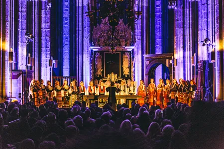 Waar anders dan op Le Guess Who? staan het publiek rijen dik buiten voor een traditioneel Bulgaars vrouwenkoor? Nou is er met festivalopener Le Mystère des Voix Bulgares natuurlijk wel iets bijzonders aan de hand: de traditionele volksliederen van het koor van de Bulgaarse staatstelevisie werden al in de late jaren '50 op band opgenomen, maar het koor kreeg pas echt een cultstatus toen 4AD-baas Ivo Watts-Russell in de jaren '80 de muziek opnieuw uitbracht op zijn label, tussen releases van Bauhaus, Pixies en Cocteau Twins. Met zo'n dikke aanbeveling krijg je de grote Domkerk wel vol. Meer dan vol zelfs. Bij aanvang van het concert staan er nog zeker honderd man voor de deur, natgeregend en teleurgesteld: ze passen er niet meer bij.