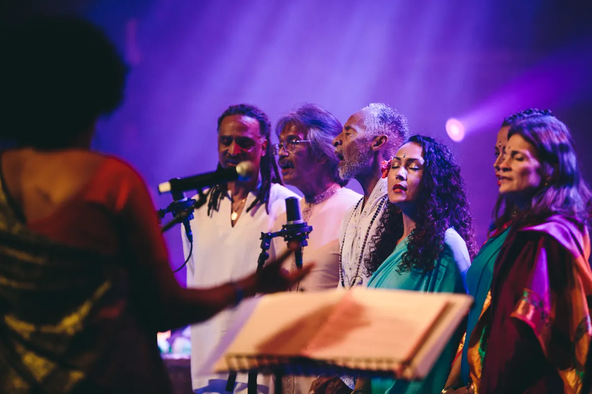 Dan maar de schrik bekomen in TivoliVredenburg, bij twee muzikanten van jewelste die je vanuit het hiernamaals toezingen: zowel Alice Coltrane als Sun Ra streefden tijdens hun leven met kosmische jazz beiden al iets hogers na en leven nu verder in de vertolkingen van hun muziek. Coltrane zelf lacht vanaf een portret op een altaartje de Grote Zaal toe terwijl zangers van de Sai Anantam Ashram haar spirituele liederen zingen. Nadat haar man John overleed, keerde de pianiste/bandleider de jazz de rug toe en zocht ze spirituele steun bij een goeroe. Ze stichtte vervolgens zelf een Ashram en begon haar eigen gospel-variaties van traditionele Hindoe-liederen te componeren met eigenwijze drones van synthakkoorden. De cassettebandjes die ze in die tijd uitbracht werden lang als het minst interessante gedeelte van haar oeuvre gezien, totdat David Byrne’s label Luaka Bop eerder dit jaar een fraaie compilatie van Coltrane’s latere jaren uitbracht. Bij binnenkomst in de Grote Zaal krijgt iedereen dan ook een tekstboekje in de handen gedrukt, om de schoenen uit te doen, in kleermakerszit op een geel kussentje te gaan zitten en uit volle borst mee te zingen totdat je je vervult voelt van Krishna. Helaas: de liederen zijn prachtig, maar het blijft allemaal net iets te gezapig en vrijblijvend. De zaal stijgt pas op wanneer het koor de mantra’s loslaat voor een prachtige lange zangsolo met trillende en bevende stem, daarna een gierende saxofoon en tUnE-yArDs die aanschuift voor een krachtig vraag-antwoord-spel.