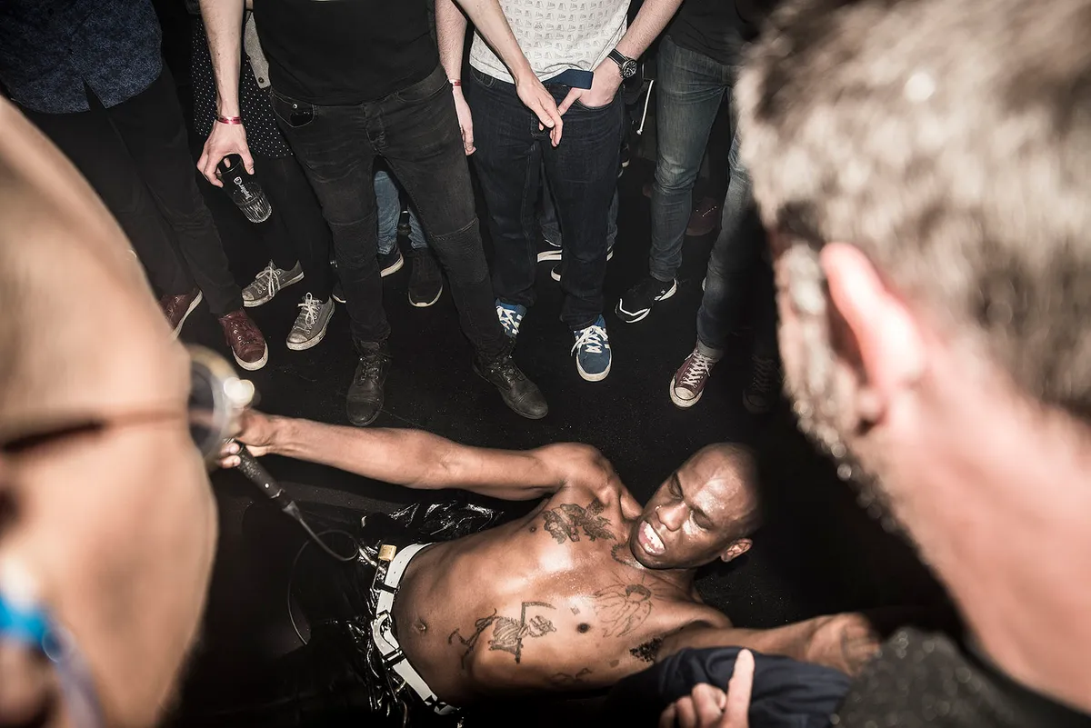 ‘De kans dat je hier tijdens de show nog binnen komt is ongeveer min 10 procent’, klinkt het dan ook om kwart over 4 ’s middags buiten de ingang van EKKO. Binnen stormt tien minuten later nog zo’n figuur van formaat het podium op: Sean Lea Bowie alias Yves Tumor, in een bizarre zwartleren broek en iets dat eruit ziet als een uitgescheurde dwangbuis. Hij is zo’n type dat je niet alleen in een duister steegje uit de weg zou gaan, maar waar je ook op een zonnige dag in een drukke winkelstraat met een dikke boog omheen zou lopen. Tumor lijkt namelijk iedereen mee te willen sleuren richting de poorten van de hel. Op zijn CDJs draait hij het gezoem van hele dikke vliegen – die best eens boven een flink stuk rottend vlees zouden kunnen samenzwermen – en het nerveuze gegrom van een koe op weg naar het slachthuis. Al snel begint hij te schreeuwen en gillen. Even later komt er een gabberkick bij en een beat vol noise die uit het donkerste kraakhol afkomstig zou kunnen zijn, terwijl hijzelf in het publiek springt, dat meteen meters uitwijkt. Bij punkshows zie je vaak dat zulke confrontaties een beetje gezellig blijven en de zanger vriendelijk-voorzichtig is in de moshpit, niemand moet zich immers echt stevig bezeren. Yves Tumor lijkt het tegenovergestelde te denken: hij plant zijn elleboog in het gezicht van een meisje, gooit zijn volle gewicht op een ander om te blijven duwen zodat hijzelf kronkelend op de grond valt. Confronterend, naar en onthutsend. Al helemaal voor de mensen die ‘m slechts kennen van dat ene wonderlijk mooie lofi-soulliedje.