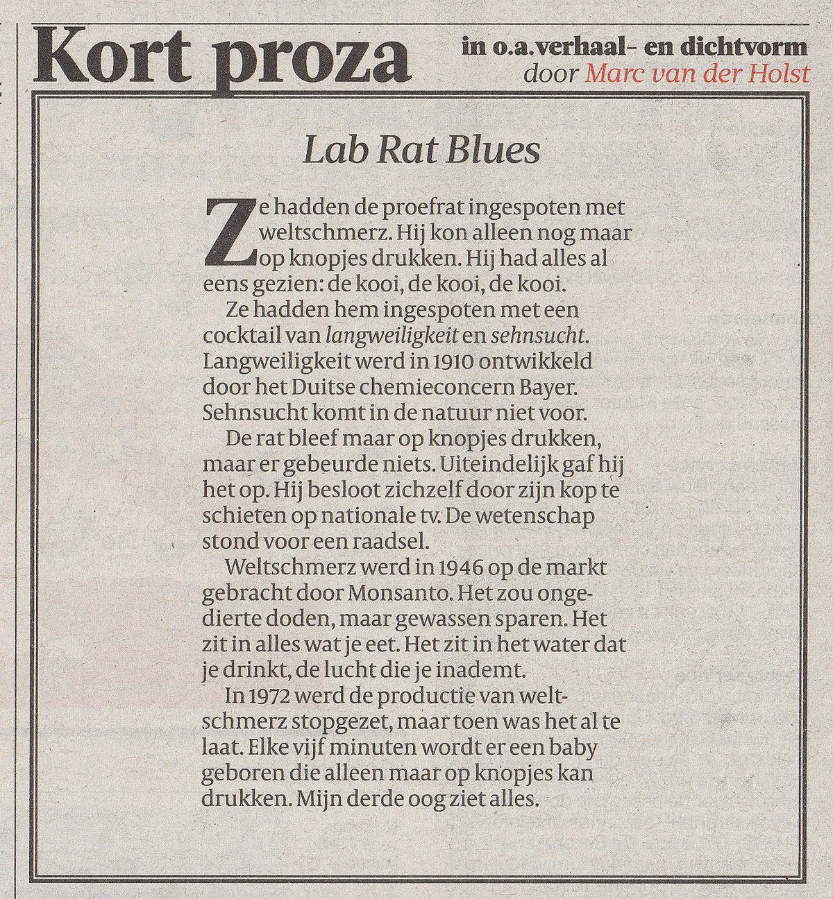 Het bewuste nummer zit vol zinnen waarvan zelfs het grote chagrijn aan het schaterlachen slaat, maar moest volgens Marc van der Holst ook weer niet té grappig worden. Het plan om een kinderkoor aan het liedje toe te voegen, werd vrij snel naar de prullenbak verwezen. ‘Dan wordt het meteen zo ‘Brick in the Wall’.’ Nee, leuker vindt Van der Holst zijn vondst helemaal aan het begin van het liedje. Daar onthult een achterstevoren afgespeelde plaat een geheime boodschap: ‘In the name of God, let the churches burn.’ Komt uit een track van de Noorse black metalband Darkthrone, vertelt de gelukkige vinder. ‘Ik had wel bedacht dat ik zo’n achterstevoren afgespeelde plaat op het album wilde, omdat ik dat ook echt gedaan heb toen ik zestien was. Gek genoeg vond ik toen het perfecte fragment. En Darkthrone bleek ook nog best een fantastische band te zijn.’