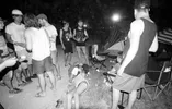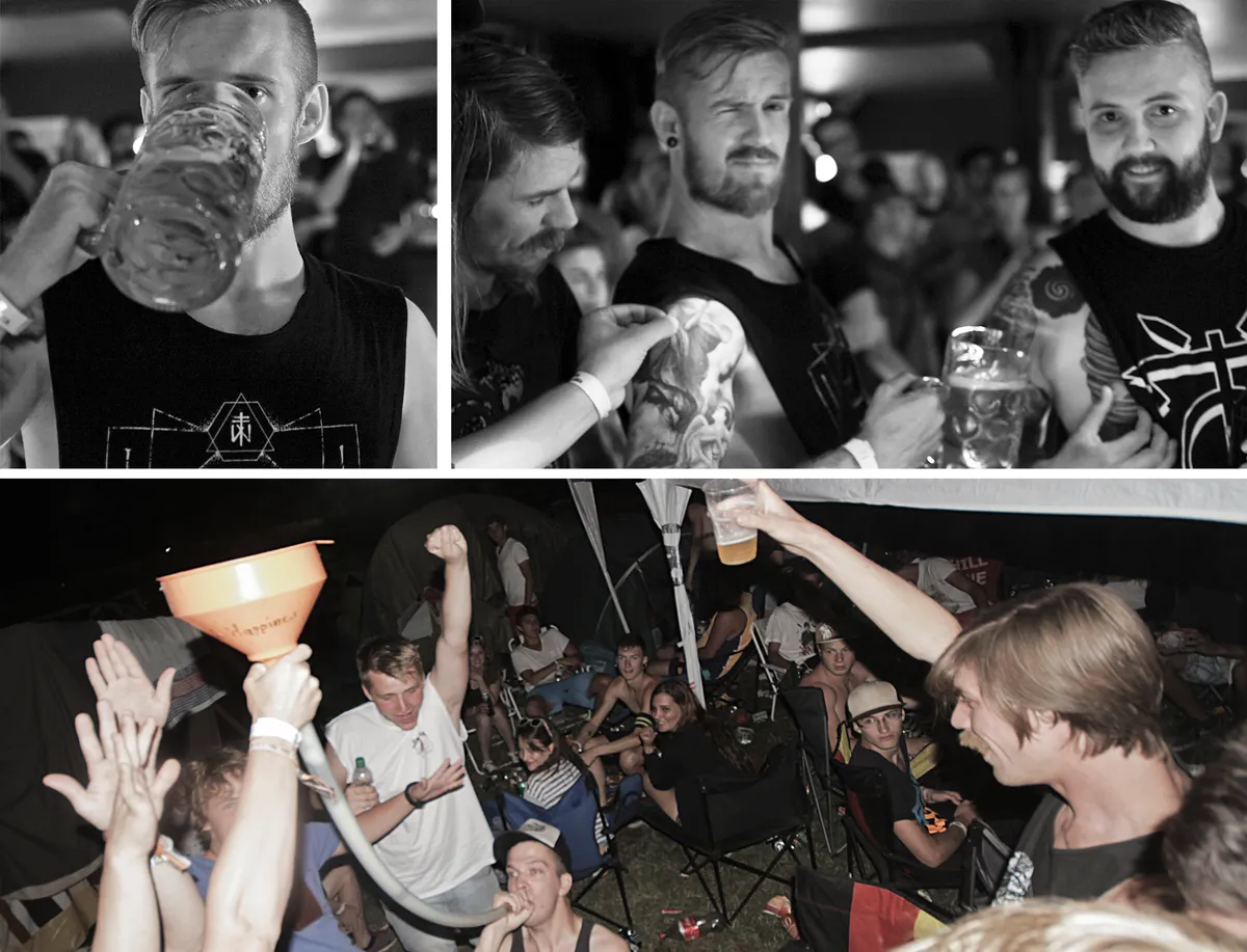 Veel en vaak, dat is het credo. Vooral op de camping kwamen wij in onze LL-jaartjes volledig tot ons recht op dit vlak (Een blikje warme Hoegaarden bleek elk jaar weer 'The Breakfast of Champions'). 'Te veel' is echter ook met bier drinken een risico. Geen van de heren op de foto ontsnapte deze bewuste avond aan de hamer. Een watertje op z'n tijd doet wonderen. 'Leaves more time for drinking!'