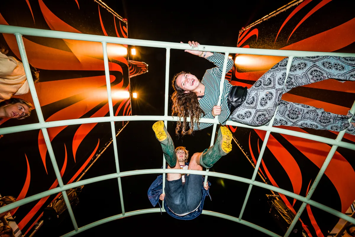 Heen-en-weer lopend tussen de twee belangrijkste vluchtheuvels voor elektronische dansmuziek op Lowlands (de X-Ray en de Bravo) spoel je vanzelf een keer aan bij de nieuwe Armadillow, om er vervolgens langer te blijven hangen dan eigenlijk de bedoeling was. Want het is leuk onder de oranje schoorstenen.Het nieuwe 24-uurs gebied is opgezet als een soort woestijnkamp, compleet met tarps in camouflagekleuren en overal staan bankjes en zijn verhogingen om op te zitten of te dansen. Vrijdagnacht bouwden Sandeman en Aux Tha Masterfader er al feest met een mix van pophits en discoklappers, vanavond staat het er wederom propvol terwijl de Groningse dj Thee J Johanz de massa test met een dubby housetrack. Een beetje suf is het wel dat je in de Armadillow blijkbaar het lekkerst danst met een afgebroken plantentak in je hand. Tegelijkertijd is het fijn dat de security niet gelijk in de stress schiet in deze vrijhaven, waar je ongestoord ondersteboven in een klimrek kunt hangen, als je daar om twee uur 's nachts dringend de behoefte toe voelt. Vroeger had de Groove Tube diezelfde vrije vibe en het is fijn dat er weer zo'n alles-kan-en-alles-mag-plek is op Lowlands.