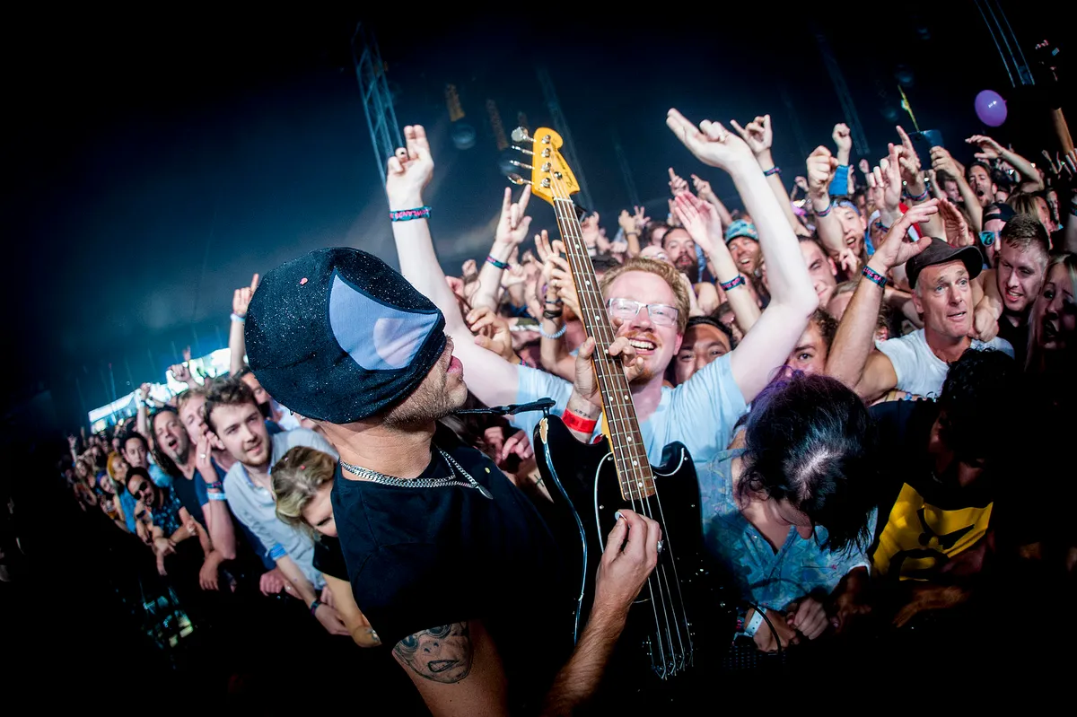 In het symphonisch klinkende outro van ‘The Beat’ doven de lichten en gaat alle aandacht naar de crowdsurfende man met geel hoedje en roze glitterpak. Onder luid gejuich drijft hij gelukzalig rond over de zwetende massa in de pit en is daarmee het meest oprechte special-effect van de hele show.