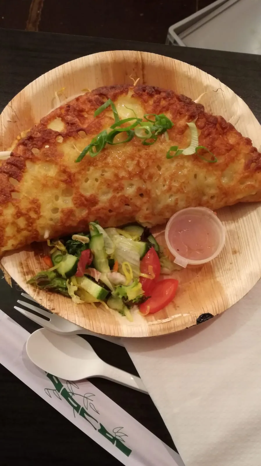 Bánh Xèo of zoals we in Holland zeggen: een lekker vette pannenkoek. Newsflash! Er zitten geen eieren in. Dubbelgeklapt met kip, taugé en paddestoelen is het een echte lifesaver. De vissaus maakt het af. Voedzaam en erg lekker.
