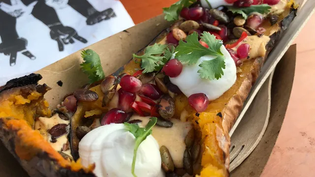 Smokey Goodness barbecuet alles wat ooit een hartslag had. Koeien, varkens, kippen; alles verdwijnt in de ovens of op de bakplaat. Dit jaar kun je ook pompoen van de barbecue bij ze bestellen. De zwartgeblakerde pompoen laat zich makkelijk leeglepelen. Geitenkaas, koriander en granaatappel zorgen voor een puike smaak. Voedzaam, lekker en diervriendelijk!