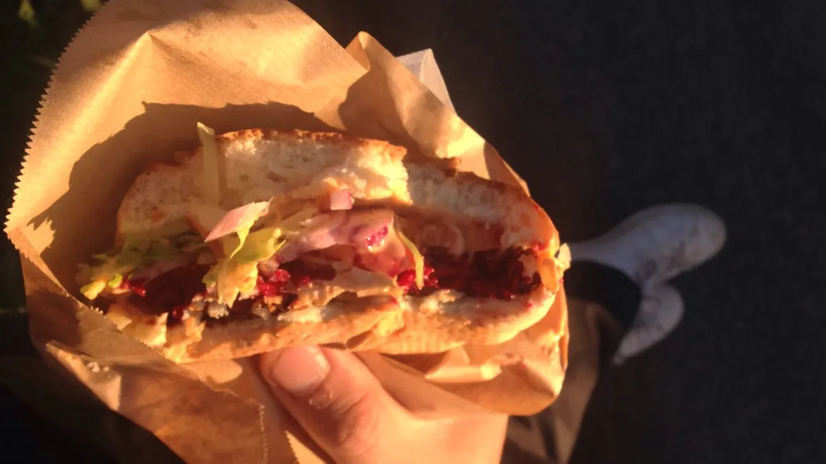 Inmiddels een graaggeziene gast op elk festival; de bietenburger. Hapklaar doch stevig broodje, een bak knisperige ijsbergsla en een knappe bordeauxrode vriend erop met oldschool whiskeysaus. Yes, de bietenburger in optima forma! Stelt inmiddels al nooit meer teleur.
