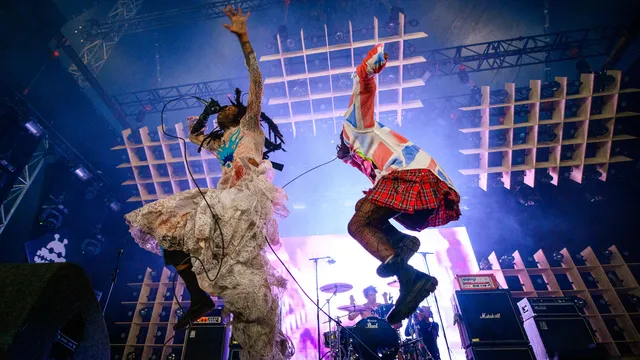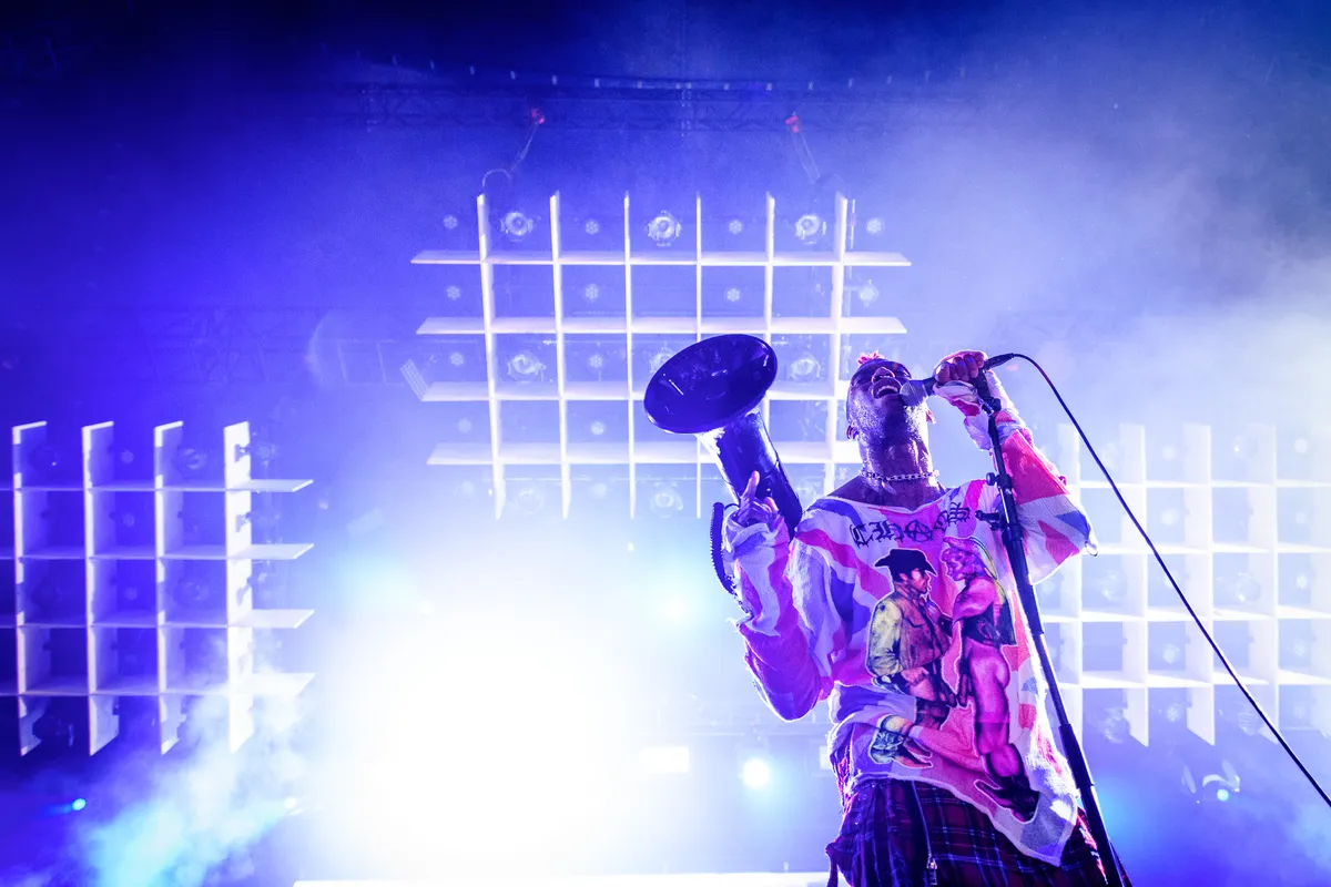 Het lijkt wel alsof er een hele sterke magneet vooraan in de India is ingeschakeld. Eentje waar alle brede gasten op af vliegen, zich een weg beukend door de mensenmassa. Die magneet, die heet Ho99o9, en hij trekt liefhebbers aan van de heftigste moshpits. Niet de laffe kinderdiscovariant zoals we al bij Leafs en Jacin Trill zagen, maar kolkende mensenmassa’s waar je tenminste vijftien blauwe plekken oploopt, en je arm breekt als je niet uitkijkt. theOGM, de ene van Ho99o9, zwalkt over het podium in een bloederige bruidsjurk. Eaddy, de ander, in een Schotse kilt en met rood hanekammetje en tussen hen in staat een trashmetaldrummer die zijn dubbele bass-pedaal wel weet te vinden. Achter hen flitsen beelden langs van nucleaire paddestoelwolken, vingers die zich in bloedende oogkassen wringen en het ontbindende lijk van een varken.