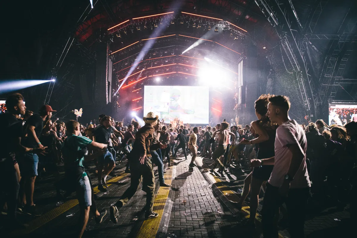 Dat zorgt wel voor meer ruimte tijdens een Wall of Death, natuurlijk. Die is werkelijk gigantisch, helemaal tot achteraan tegen de geluidstafel aan. Het is een waanzinnig gezicht hoe de twee groepen op elkaar crashen.