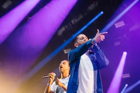 De performance van de band is ook nogal, eh… veel. Eerst laten frontmannen Hakim Meridja en Aurélien Zohou - de één een zanger, de ander een rapper - hun stemmen minutenlang vanuit de coulissen de tent in galmen, daarna stuiteren ze continu over het podium om te vragen om handjes in de lucht, handjes van links naar rechts en handjes tegen elkaar. Het voelt vooral als goedkoop effectbejag, die de show allesbehalve subtiel en smaakvol maakt.