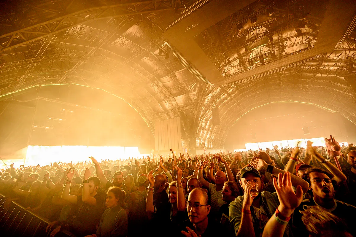 Om op de finaledag van het festival nog een beetje op gang te komen richting de avond, is een potje beuken met beats wel gewenst, dus staat de Bravo-tent helemaal vol bij aanvang. Modeselektor weet daar wel raad mee, de eerste 25 minuten serveert het Berlijnse duo zonder genade een donkere deken van nijdige snares en zompige beats, voorzien van zenuwachtige futuristische visuals. Maar beuken gaat bij Modeselektor nooit eenvoudig rechtdoor, er zit altijd wel ergens met opzet breakbeat of opjuttende melodie in verwerkt. De beuksessie wordt vanavond afgerond door een plotselinge, wel heel erg gepassioneerde oproep om ‘Fuck’ te zeggen tegen alle haters, racisten en fascisten.