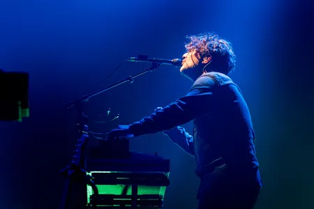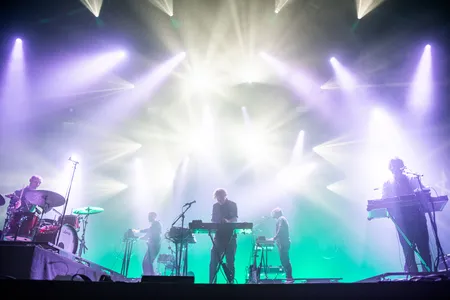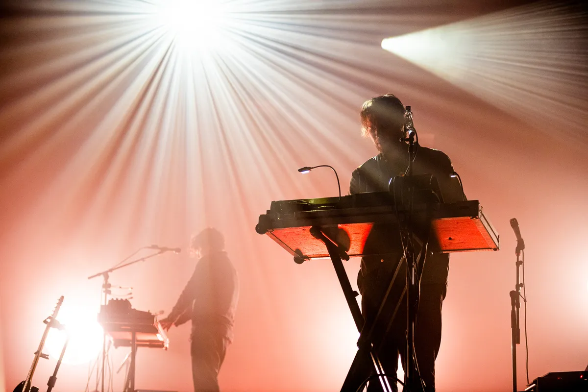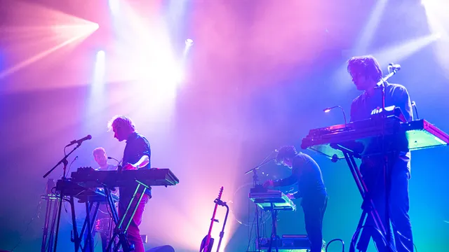 Mensen die de band goed kennen weten dat natuurlijk wel. Zij hoorden vast het recente album The Weight, en met ‘Are You Even Real’ van dat album begint vanavond de set. De twee oerleden zijn nog altijd het meest zichtbaar, en tegenwoordig ook hoorbaar, want er wordt meer gezongen dan voorheen. Al kunnen we niet bepaald spreken van een frontman, een gezicht. De vocalen vormen een laag in het geheel, in de dromerige composities. Het is als Apparat zonder knaldrang, jazz zonder blazers, krautrock en dreampop gaan een teder verbond aan, en ja, af en toe geeft de band een beetje gas, net genoeg om de knaldrang aan te blazen als hete kooltjes in de bbq. Uitbundig wordt het niet, en euforisch climaxen jaagt Weval al helemaal niet na. In plaats daarvan baden de vijf bandleden - over hun instrument gebogen - in sfeervol groen en paars knipperend licht. En als de registers vol open gaan, gaan de witte knipperlichten aan.