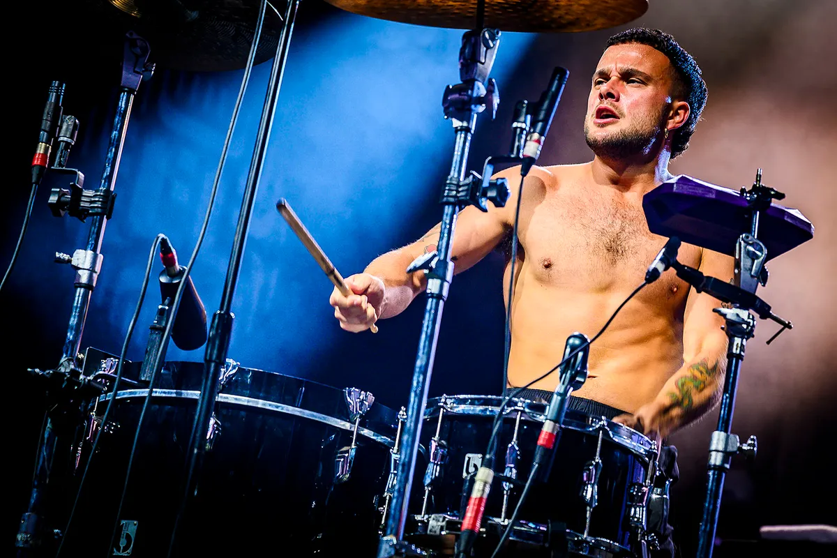 Slaves is dus een boze band, maar dat betekent niet dat er niet gelachen mag worden. Zo staan we met zijn allen al op het verkeerde been bij de introtape van de Vengaboys, is roadie Tom een running gag omdat hij na elk nummer het drumstel weer in elkaar moet zetten en lacht Isaac de tekst uit van zijn eigen liedje ‘Debbie’. ‘Debbie, where’s your car, is it far? We actually wrote that.’ Het is ook een komisch duo om te zien, Isaac en gitarist Laurie Vincent. Isaac heeft niet meer dan een klein zwart sportbroekje aan en slaat met wild maaiende armen op zijn minimalistische drumstel, terwijl Laurie met zijn panterbontmuts juist een enorme stack versterkers heeft.