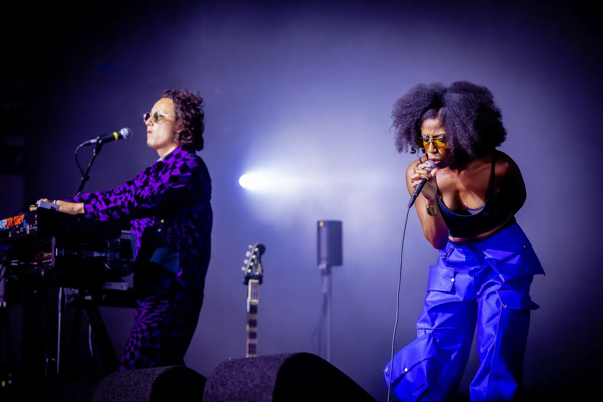 Als het stijlvol geklede duo na tien minuten extra wachttijd opkomt onder luid gejuich, zingen ze het van Topical Dancer afkomstige ‘Hey’, waarin ze zich met een herhalend en swingend ‘Hello!’ voorstellen aan het welwillende publiek. ‘Er hangt hier een goeie vibe,’ zegt Charlotte, een waarheid als een koe. Daarna barst het feest helemaal los met 'Blenda', een nummer over verborgen racisme in België met daarin steeds de waardeloze dooddoener dat mensen die er niet ‘westers’ uitzien maar terug moeten gaan naar hun eigen land. Toch is dit nummer het tegenovergestelde van grimmig en weten de twee met hun snijdende synths en spacey elektro-jams - en vergeet niet de waanzinnig goede zang, iedereen mee te trekken in hun bubbel.