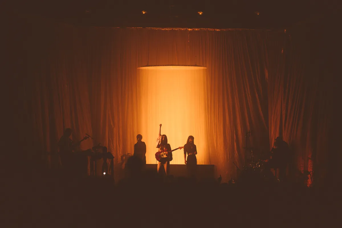 Maar hoe kan de Gentse na deze alsmaar langer wordende zegetocht nog iets extra’s doen op dit gouden festivalslot? Het is niet eens nodig om op te schakelen. De metershoge fluwelen gordijnen gordijnen die de band omringen, de enorme spiegel die eerst als een maan opstijgt en vervolgens als een vuurtoren loom cirkelt: het is moeilijk om een recente Nederlandse show te bedenken die er beter uitziet dan dit. Dan is er ook nog die synchrome slow motion choreografie met haar achtergrondzangers. En daar zit dan toch het opschakelen bij ‘De Parade’: er komen vier dansers bij. Eerst staat De Visser als cultleider centraal, terwijl de rest naast haar marcheert. Iets later roepen de dansers weer die zachtheid op die als rode draad door de set loopt.