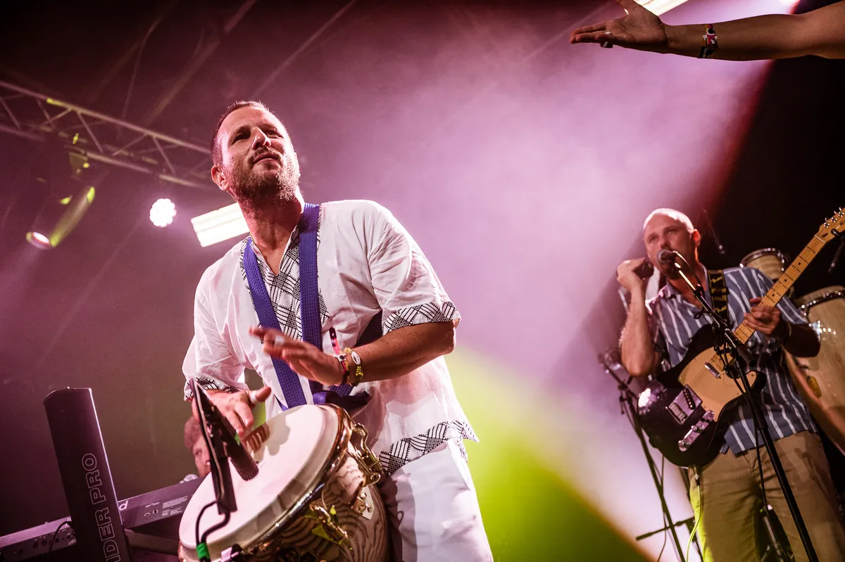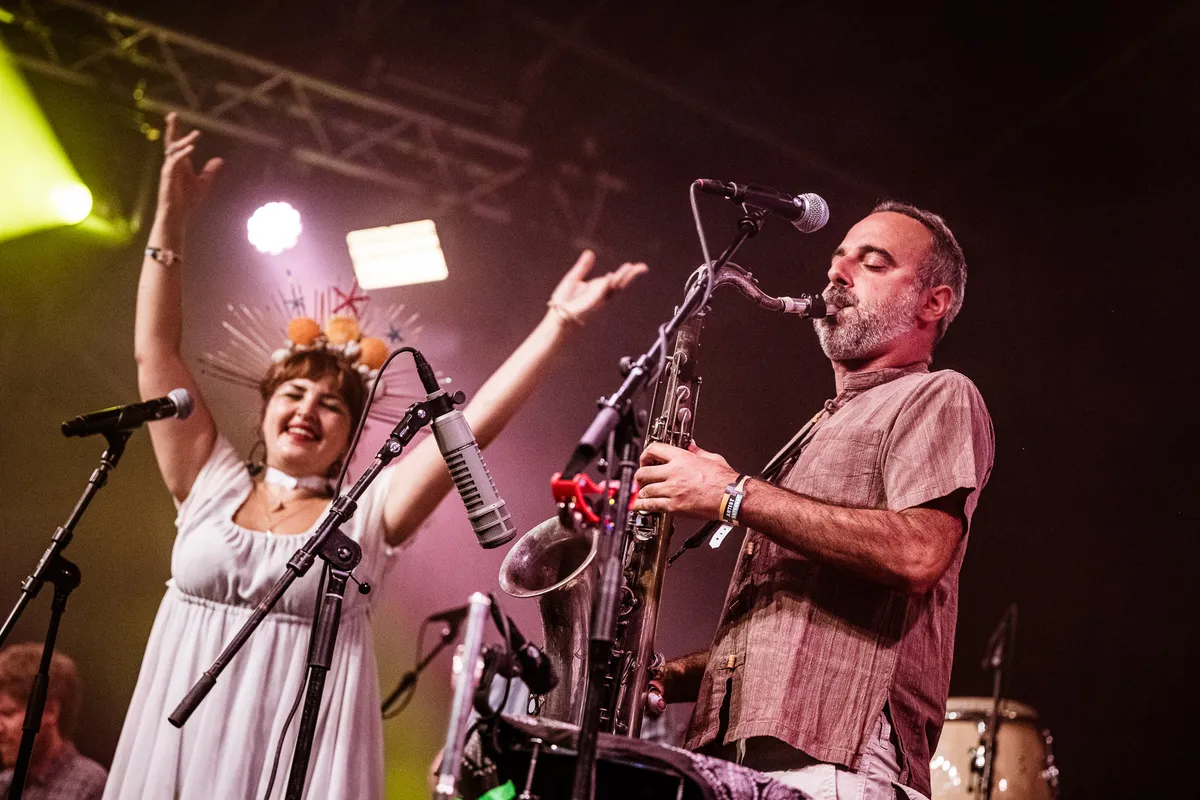 De naam is dan wel veranderd, ze spelen nog steeds afrobeat met her en der wat Zuid-Amerikaanse en andere niet-westerse invloeden. Terwijl de zangeres met zonnekroon enorme kanten vleugels uitslaat, de drummer en percussionist het geregeld opnemen tegen de blazers, toveren de bandleiders spacy wooshes en lasergeluiden uit hun synths. Staan we opeens met een been in de space disco. Het feest buiten is inmiddels veranderd in een gezellige borrel, maar binnen wordt iedereen meer en meer de show ingetrokken.