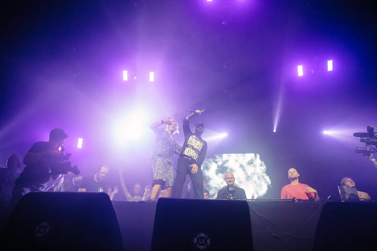 De reden dat Skrillex hier staat, is natuurlijk dat de Groninger drum-’n-bass-groep Noisia dan toch eindelijk hun afscheidsshow mag spelen in de India. Drie jaar geleden wilden Nik Roos, Martijn van Sonderen en Thijs de Vlieger dat eigenlijk al doen, maar een zeker virus gooide roet in het eten. Lowlands 2022 is dus de tijd en plek geworden voor de allerlaatste set ooit van Noisia, en wel tijdens de zondagnacht in de India waar het genre traditioneel hoogtij viert. En dat het bij tijd en wijle emotioneel wordt, na twee decennia de wereld veroveren met keiharde bassen, overstuurde elektronica en een fijn gevoel voor regelmatig een catchy haakje, is natuurlijk geen verrassing. Twee uur lang laat Noisia werkelijk elke banger die ze ooit produceerden voorbijkomen, waarbij ze elke drop, elke gebroken beat, elk geluidje eigenlijk nog kennen, zo valt van hun lippen te lezen. Het podium staat overvol met vrienden en bekenden als Noisia meteen met een group hug het podium betreedt. Ook Huilende Rappers-tracks komen voorbij, en Kraantje Pappie is er om ‘Feesttent’ te doen (‘weinig mensen weten dat wij dit hebben geproduceerd').