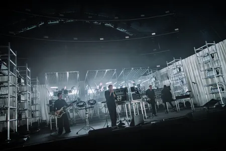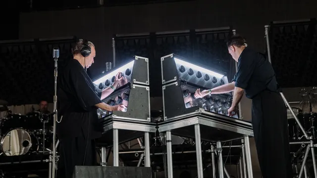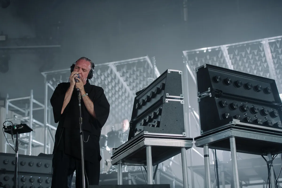 Dan gaan de vierkwartsmaat en de synths de dienst uitmaken in ‘Missing Wires’ en komen we op bekend terrein. De grooves zijn donker en heavy, Steph en Dave stellen zich ondergeschikt op aan het ritme. Het is gek wat een fysieke ervaring dit is. Drie synths of drie gitaren kunnen in je hoofd naast elkaar bestaan, drums stapelen. Die voel je, ook nu ze weer achter op het podium staan in plaats van vooraan zoals bij de vorige incarnatie van de band. Je moet wel helemaal middenin de tent gaan staan of op de schermen kijken om ze te zien, want die witte doeken aan weerszijden benemen je het zicht. Rare keuze om het zo te doen. Het werkt misschien in een kleine zaal als Paradiso, maar hier niet.