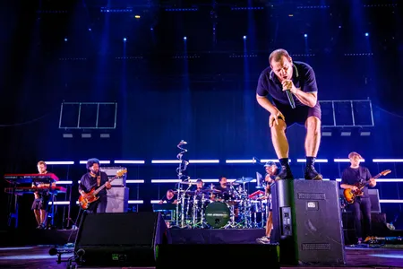 Het duurt niet lang voor Skinner zijn belofte inlost: hij regisseert op theatraal knullige wijze dat hij van zijn monitor af gaat springen en dat wij dan gek moeten worden. Hij gaat springen, wij worden gek, ok? Hij springen, wij gek. Springen, gek. Daarna sprint hij naar buiten, op zoek naar sterke schouders, waar hij voor een zee van telefoontjes een volledig nummer op afwerkt. Slim om dat bij een rustig liedje te doen, al gaat het wel een beetje ten koste van de ontroering die de liedjes zelf in zich dragen. ‘Focking zwaar’, liplezen we bij zijn slachtoffer. Je moet er wat voor over hebben om het gewicht van de show te dragen.