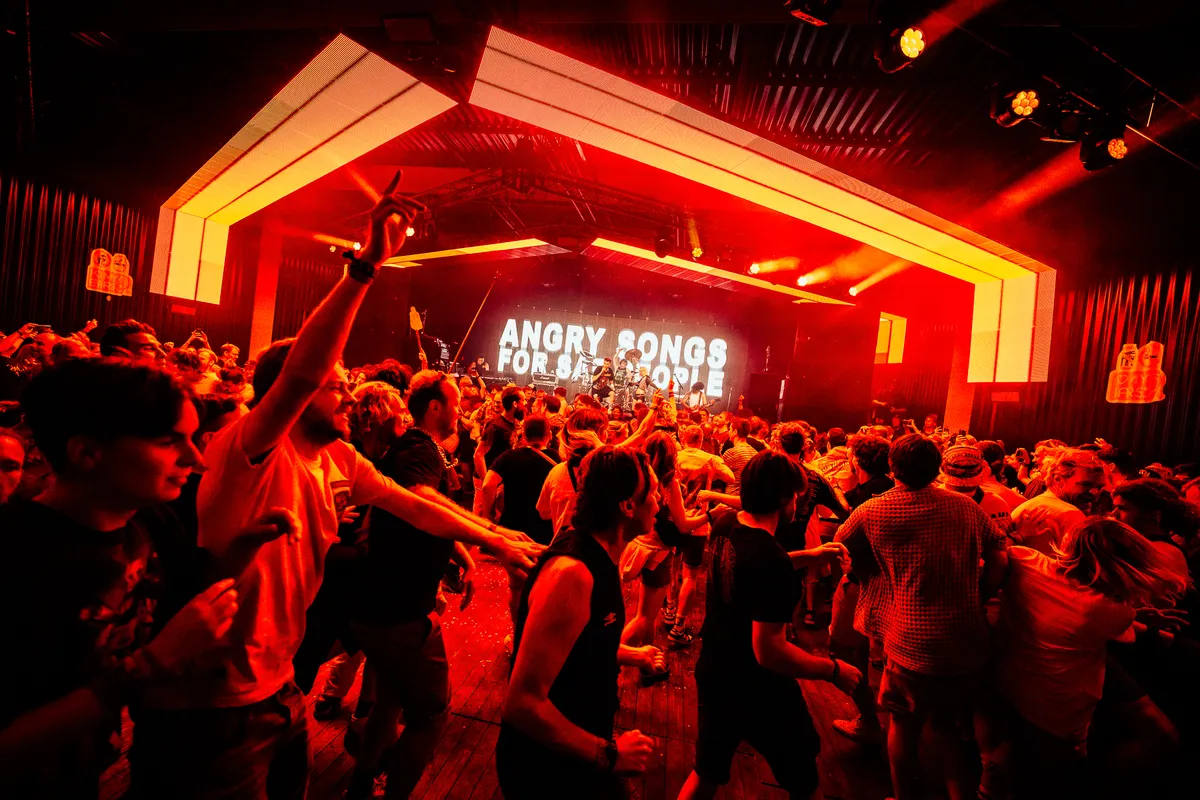 ‘Angry songs for sad people’ staat gedurende de complete show geprojecteerd achter het Wargasm-vijftal. En inderdaad, er zit voldoende woede in de tracks die hier worden afgevuurd. Droevige mensen zijn niet per se de doelgroep, eerder liefhebbers van het harde knetterende gitaarwerk. En van mospits. Want die worden meteen door zanger/screamer Sam Matlock opgeëist. De energie mag niet alleen op het podium blijven.