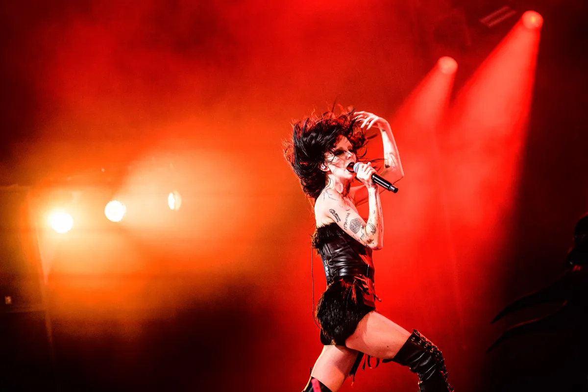 Geen ‘Doomsday Blue’ dus. ‘Maar’, vervolgt hen, ‘Het is wel een bijzondere dag voor mij, want ik heb sinds oktober geen nieuwe muziek uitgebracht, tot vandaag.’ Nieuwe single ‘Redrum’ is een spijkerharde elektronische metalplaat, de hardste in de set. Een protestsong tegen de argageddon waar we ons middenin bevinden. ‘Mij niet bellen’, roept een meisje vooraan angstig als Bambie Thug vraagt om een circle pit. De rest vliegt er vol in, net als de artiest zelf, die krijsend en tollend over het podium springt, en eindigt met de Palestijnse en de transvlag. More blacks, more dogs, more Irish, more trans people.