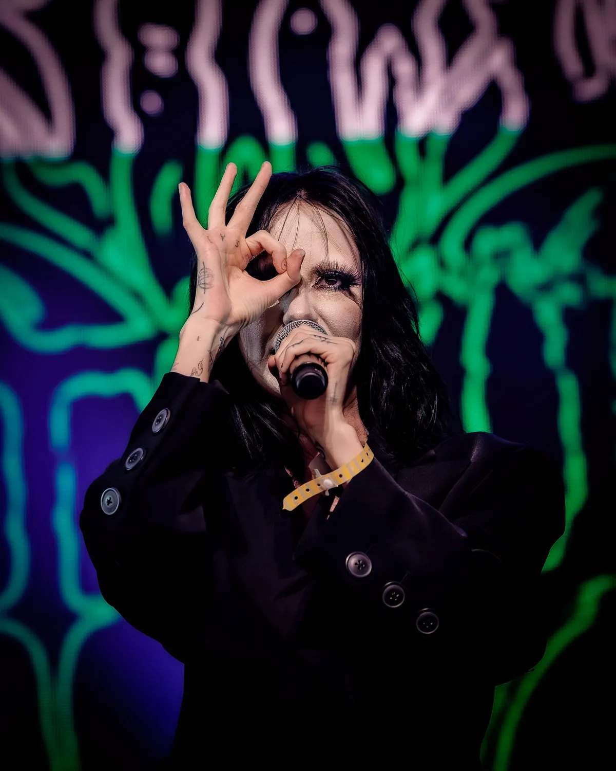 ‘Het volgende liedje gaat over pik zuigen’, kondigt Bambie Thug het nummer ‘Kawasaki’ aan, om vervolgens twee gemaskerde mannen – een soort duivelse octopussen met 'ARM THE GAYS' op hun shirt – te berijden, van wie er één likkend tussen diens wijd geopende benen eindigt, terwijl een spervuur van harde beats en metal riffs de tent in knalt. Wie hier argeloos binnenloopt zal wel schrikken, maar Bambie Thug staat voor radicale vrijheid met een occult randje. Het Bambie Thug-logo boven de artiest oogt metal, maar dan wel met de kleuren van de Palestijnse vlag. Wat gebeurt hier allemaal?