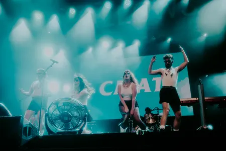 Al na haar eerste liedje blijkt: CMAT heeft een PERSONALITY, all caps. Ze buitelt over het podium heen, vliegt, flirt met de camera. Zo’n beetje ieder liedje wordt aangekondigd met een karatetrap. En dan nog de uithalen: ieder liedje weer, benadrukt met grootse handgebaren, vertrokken gezicht, vanaf openingssong ‘Jamie Oliver Petrol Station’ gaat ze van nul naar honderd. ‘Op dit punt van de show ben ik vaak bekaf,’ hijgt ze na ‘Running/Planning’. En dan moet ze nog een halfuur!