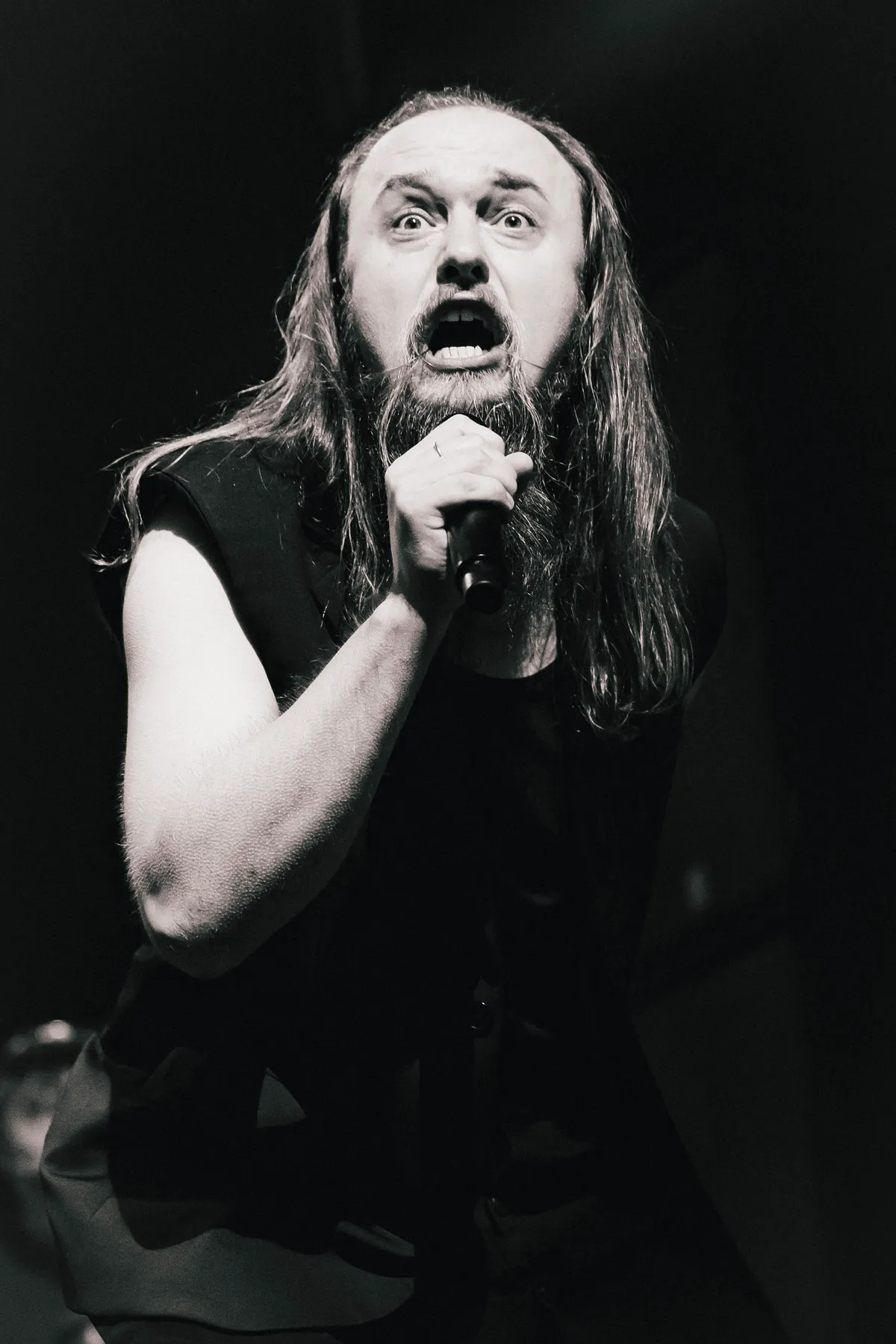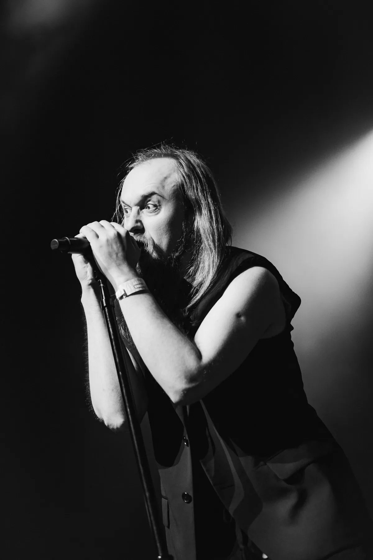 Egor Shkutko is een intense frontman. Hij levert zijn Russische songteksten monotoon af, in een diepe bariton. Zijn mouwloze colbert is zwart, zijn rok nog zwarter en als hij de voorste mensen een high five geeft kijkt hij ze niet aan. Hij kijkt in de verte en knippert niet eens. Zijn blik gericht op het naderende onheil. Het maakt hem extra ongrijpbaar, boven op het feit dat je van zijn teksten natuurlijk geen zak verstaat.