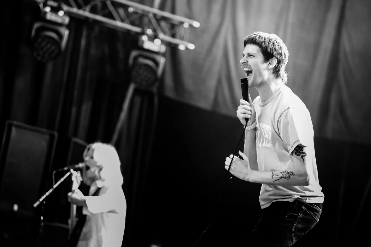 Binnen tien minuten heeft de Rotterdamse postpunkband gelukkig een vervangende versterker geregeld (‘met dank aan Julia!’, roept frontman Lukas Jansen uitgelaten). Maar tien minuten stilte op het podium is niet niks. Dat het publiek ondertussen gewoon blijft staan, zegt ook wel wat: wie Tramhaus drie jaar geleden de X-Ray uit elkaar zag trekken, heeft hun steengoeie livereputatie in actie gezien, en ook voor wie daar niet bij was werkt tweede song ‘I Don’t Sweat’ als en rode lap voor een stier.