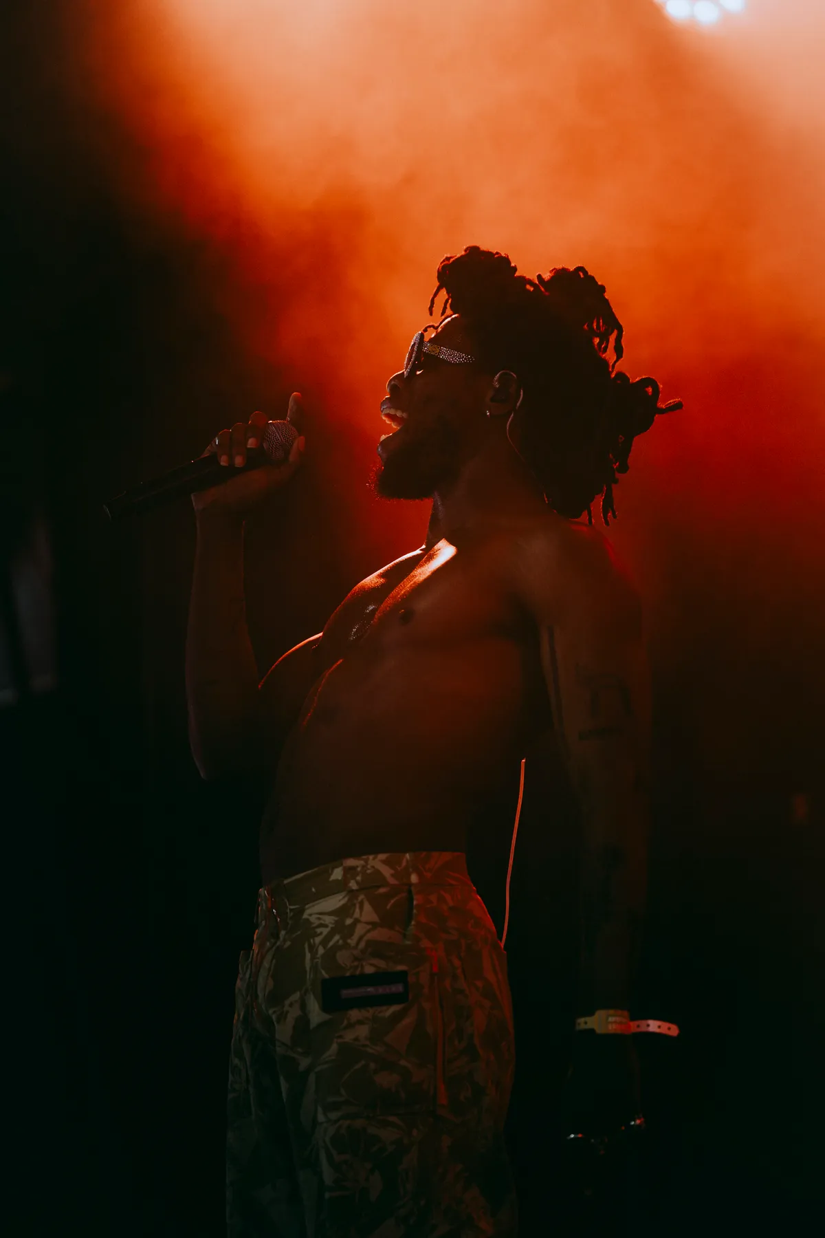 Zijn stem kan alle vormen aan nemen, zo ook op de vrijdagmiddag van Lowlands. Z’n nieuwe plaat Paradise Now leent zich perfect voor de uitleving van die diversiteit: R&B, afrobeat, altrock, synthpop, het komt allemaal voorbij. De ene keer trippelt hij ritmisch in praatrap over de beat, de andere keer schiet zijn stem in die kenmerkende kwetsbare falsetto. En dan die hoge kreetjes tussen z’n rapteksten door: ‘HAA!’, ‘SHOO!’ HO!’, alsof hij zichzelf even wakker schudt en op scherp zet. Hij gebruikt z’n stem als een instrument. Af en toe is hij een soort Kate Bush op afrobeat. Impulsief rent hij over het podium, met grootse bewegingen erbij. Soms lijkt hij haast te vogue-en. Dan weer stampt-ie, of zwaait hij met z’n microfoonstandaard door de lucht. Z’n lichaam glimt van het zweet.