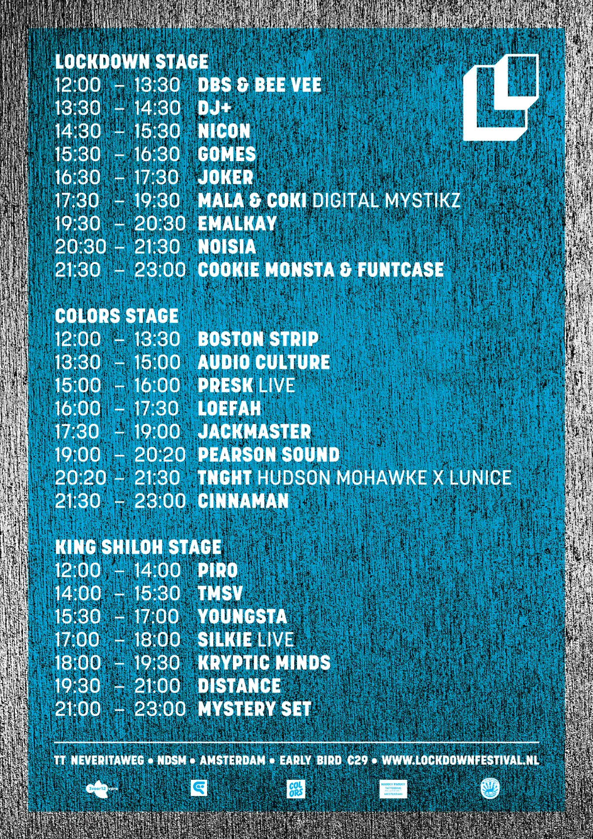 De organisatie van het Lockdown festival heeft de timetable bekend gemaakt. Cookie Monsta en Funtcase zullen het hoofdpodium afsluiten. Cinnaman sluit de dag op het Colors podium, even daarvoor staat een van de meest besproken acts van het moment op de tijdladder: TNGHT, het project van Hudson Mohawke en Lunice. Verder belooft het festival sfeervolle houten 'chillplekken' en een geheime oma's appeltaartbar.