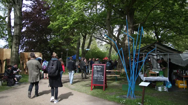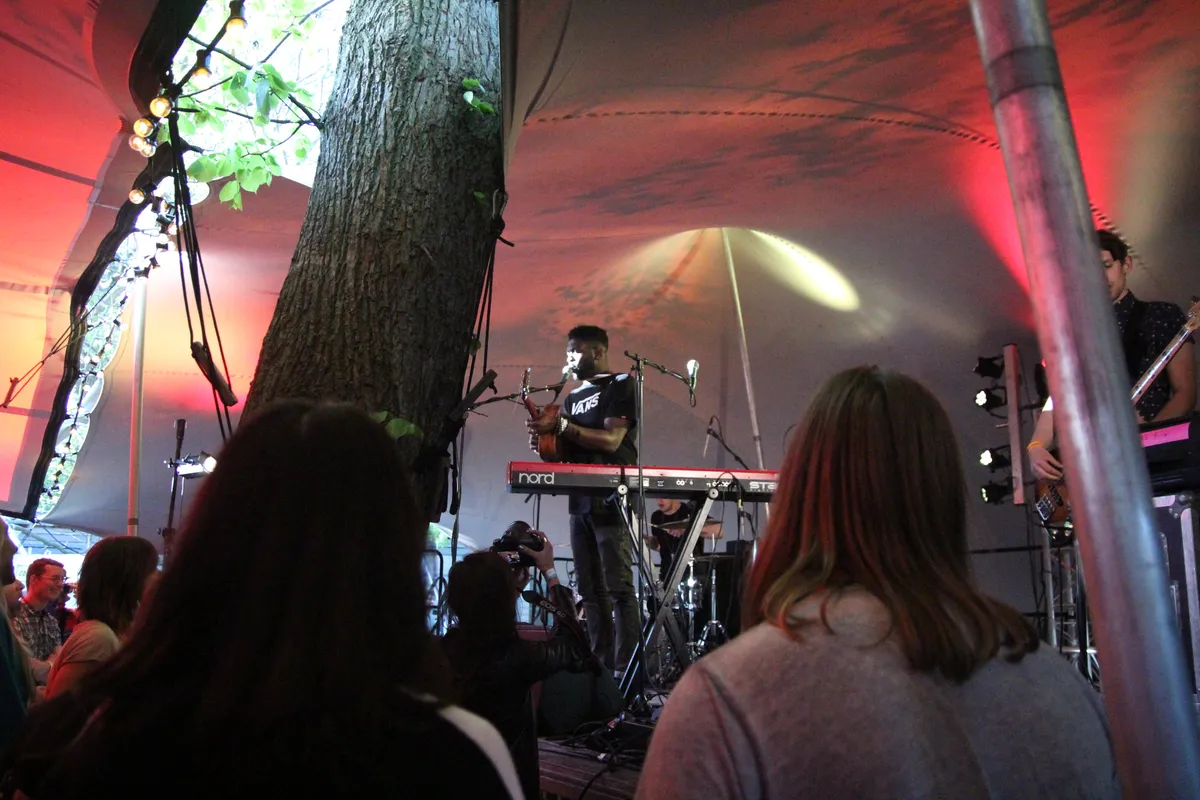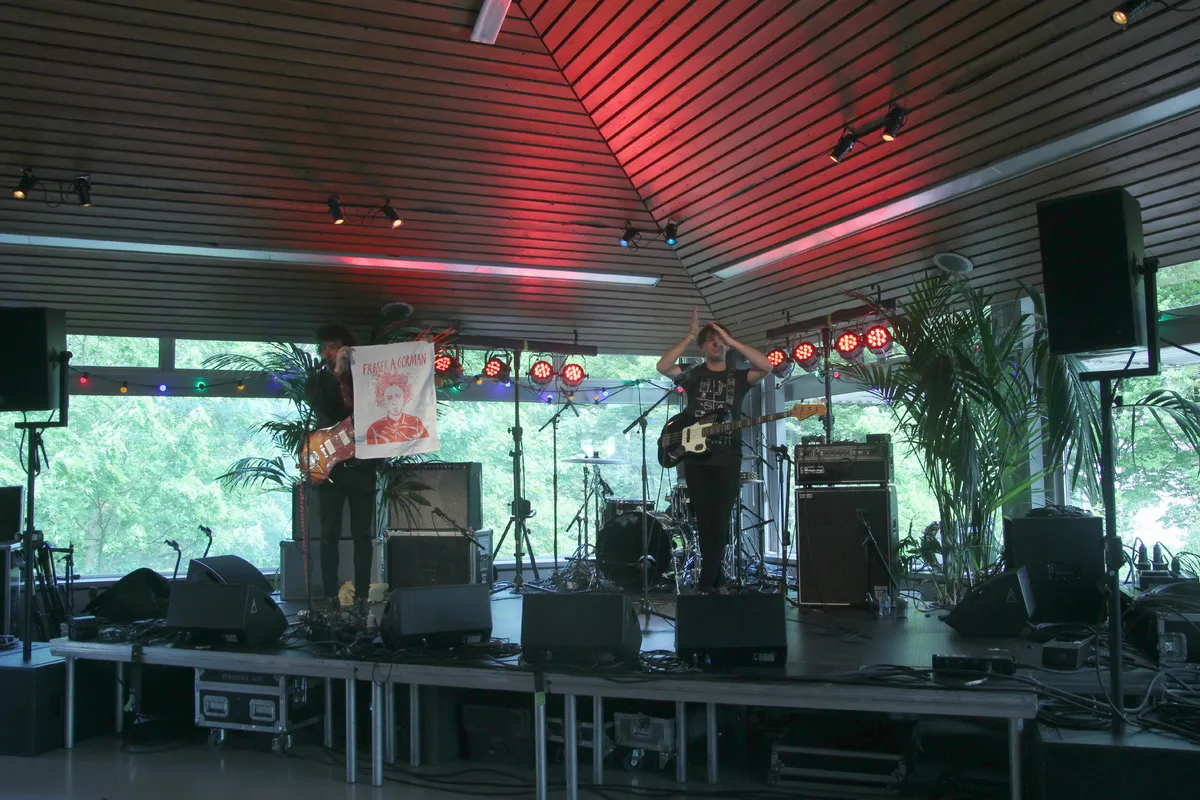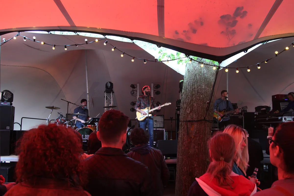 We verlaten de Noordzaal voor een ontdekkingstocht op de rest van het terrein. De meeste podia bevinden zich binnen in het vorig jaar geopende Tolhuistuin-gebouw, waar Paradiso ook bands programmeert onder de naam Paradiso Noord. Alle hoeken en gaten van het in smaakvolle jaren '50 en '70-stijl ingerichte gebouw zijn in gebruik genomen voor wel vier podia, een filmzaal en een mini-dependance van Concerto. Dan is er nog de tuin waar het gebouw zijn naam aan ontleent (enigszins verwarrend is het wel). Daar vindt het buitengedeelte plaats, op het gras en tussen de bomen. Buiten staat een aantal etenskraampjes en een grote tent die dienst doet als hoofdpodium, waarop het zicht enigszins wordt ontnomen door een grote boom die pal in het midden voor het podium staat. Sprookjesachtig, maar ook een beetje onpraktisch.