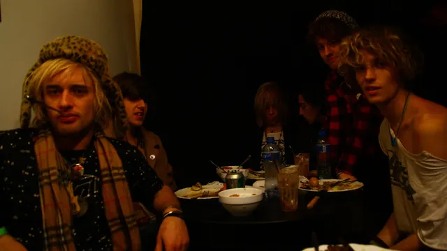 Even een hapje meeprikken in de kleedkamer van Will & The People. Want Will wil wel. Een gezellige boel, dat is het zeker. Will deelt zijn bord met de toermanager. En de rest van de groep smikkelt in de krappe lappentent die als kleedkamer dient van de restjes van de cateringmaaltijd.