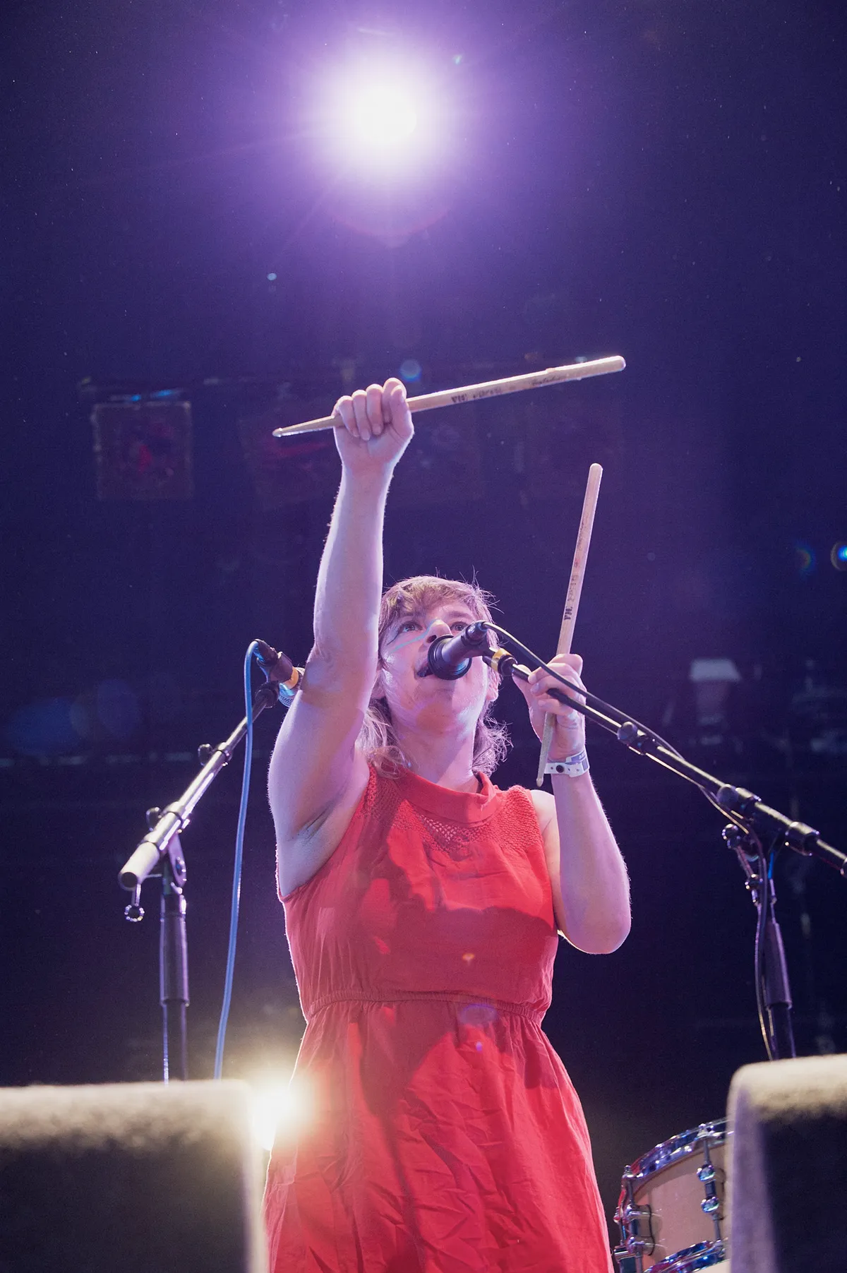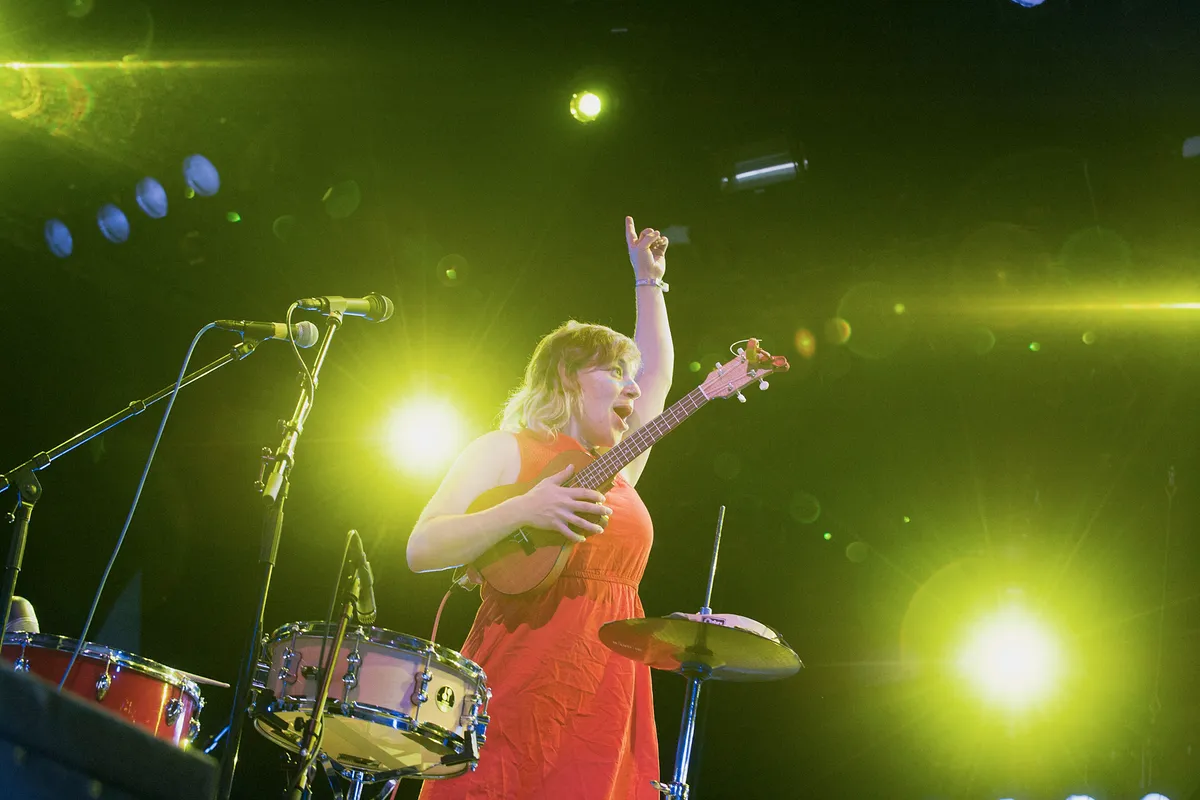 Kleur, kleur, kleur! Frontvrouw en zangeres Merill Garbus is in het rood gekleed en heeft blauwe strepen over haar gezicht lopen. De rest van haar band draagt een neongroene hoofdband en gele streepjes op het gezicht. Dat stemt al vrolijk. Gelukkig hoeft de band het niet alleen te hebben van uiterlijke gezelligheid, de muziek helpt ook een handje mee. Garbus zorgt zelf voor de drums met behulp van drumstokjes die ze nu eens tegen elkaar tikt, dan weer tegen de drums slaat die er staan. Vervolgens neemt ze dat op met haar loop-pedaal. Hetzelfde doet ze met zang en andere instrumenten (tamboerijn, ukulele). Het is een kunstje dat we vaker gezien hebben, maar live is het nog altijd spannend om te zien of het lukt. En het gaat goed. Merill laat geen stilte vallen: de set is een aaneenschakeling van nummers die naadloos in elkaar overlopen. Het werkt, want het publiek hangt aan haar lippen. De blazers zorgen voor de funky ondertoon en laten ons wat meer dansen. Het publiek zingt veelvuldig mee, en prijst Garbus telkens als ze haar hoge uithalen loepzuiver haalt. Ook het keukengerei waarmee de band speelt is verrassend. Zo slaat bassist Nate op jampotjes en een zilveren pan en helpen de blazers de percussie ook een handje mee door zo nu en dan tegen een bakplaat te tikken.