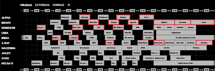 Volledige route: Jonna Fraser - Methyl Ethel - J. Bernardt - Glass Animals - Sean Paul - Shame - Mura Masa - Feist - Solange - Moderat - Iggy Pop - The xx - Marie Davidson - Midland - Job Jobse - Dixon - DJ Deeon.