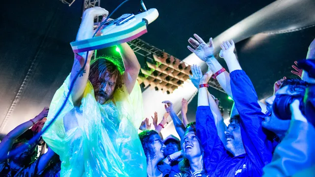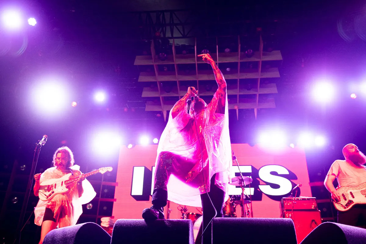 Frontman Joe Talbot paradeert binnen in een felroze regenponcho, alle ellende met vreugde bestrijdend. Gitarist Mark Bowen heeft een geel exemplaar aangetrokken en draagt verder alleen zijn onderbroek. En vakbroeder Lee Kiernan ligt al in het publiek na de eerste noten van ‘Heel / Heal’. Nee, IDLES is niet vies van grappen en grollen. Maar het vijftal is ook - nee, vooral! - een steengoede liveband. Met name bij tracks van debuut Brutalism, waaronder het luidkeels meegebrulde 'Mother', valt op hoe loeistrak de band speelt, met bassist Adam Devonshire en drummer Jon Beavis als fundament.