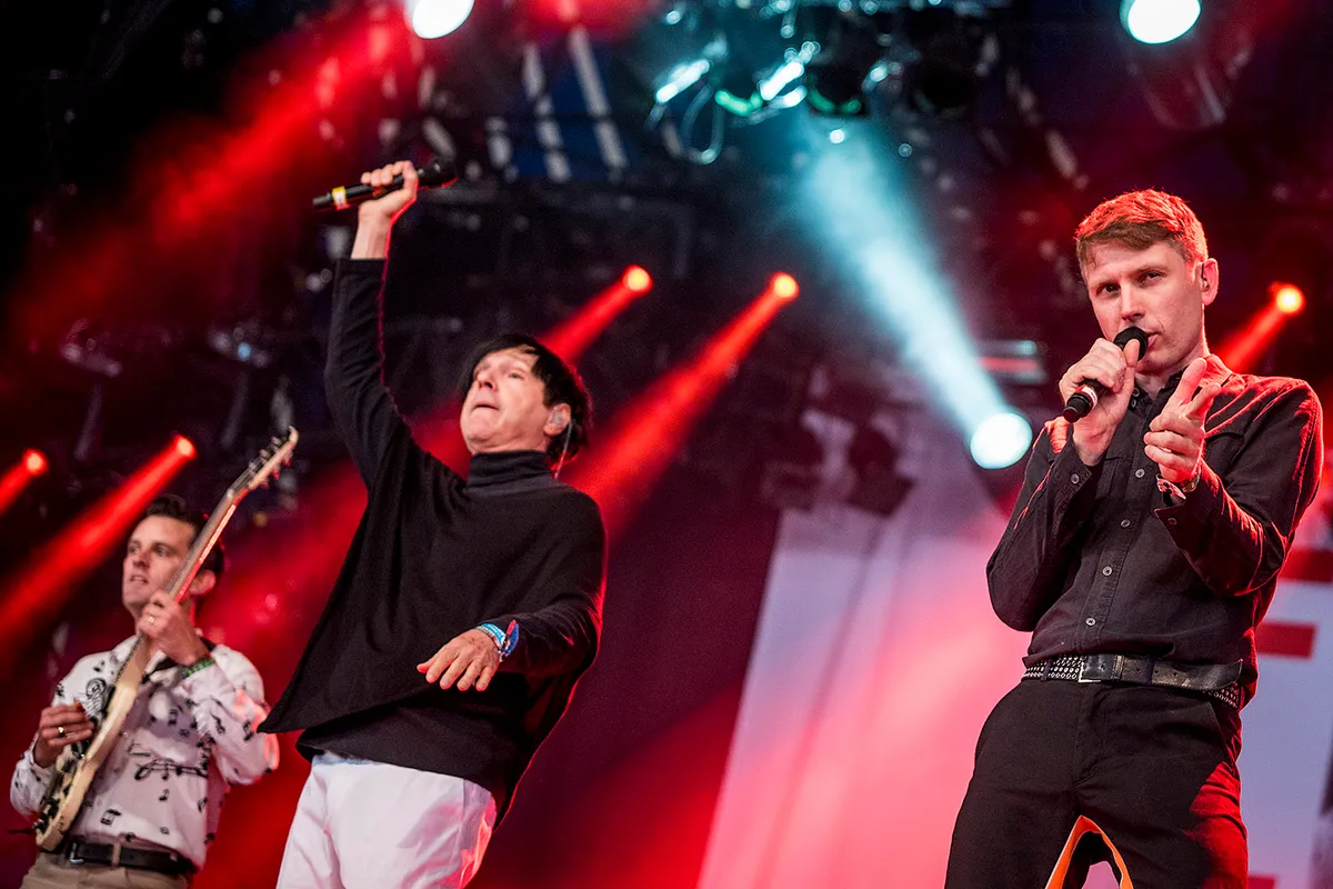 Het plezier spat al van de FFS-plaat af, maar live gaat het gezelschap ook heerlijk los. Vooral door de inbreng van Sparks heeft het project een theaterrand gekregen die ook op het podium ruimte krijgt. Dat is telkens vrolijkmakend. Bijvoorbeeld hoe Kapranos ‘Collaborations Don’t Work’ begint te zingen, het meest artistieke werk van FFS, en hoe de frontmannen elkaar uiteindelijk omhelzen omdat het allemaal tóch blijkt te kloppen. Uitschieters van die plaat als ‘Johnny Delusional’, ‘Call Cirl’ en ‘Dictator’s Son’ worden fris en strak gespeeld, maar hebben niet het hele uitbundige meespringgehalte van het Franz Ferdinand-werk. Juist dan weet Kapranos weer eens te overtuigen als frontman die ook op rustige momenten de achterste rijen van de tent kan aansturen. Het scheelt natuurlijk dat Sparks-zanger Russell Mael nog beweeglijk meedeint en de gevulde tent kan ontladen op ‘Michael’, ‘Do You Want To’ en ‘Take Me Out.’ En uiteindelijk ook op de frivool gespeelde ‘Piss Off’ van FFS zelf. Er gebeurt constant iets tijdens het FFS-optreden. Een instrumentenwisseling, een grapje, een Kapranos die op zijn knieën in medatieve houding zit. Vooraf bedacht, maar niet hinderlijk. Het is simpelweg te fijn om naar dit soort chemie te kijken en luisteren. Dit is ware liefde.