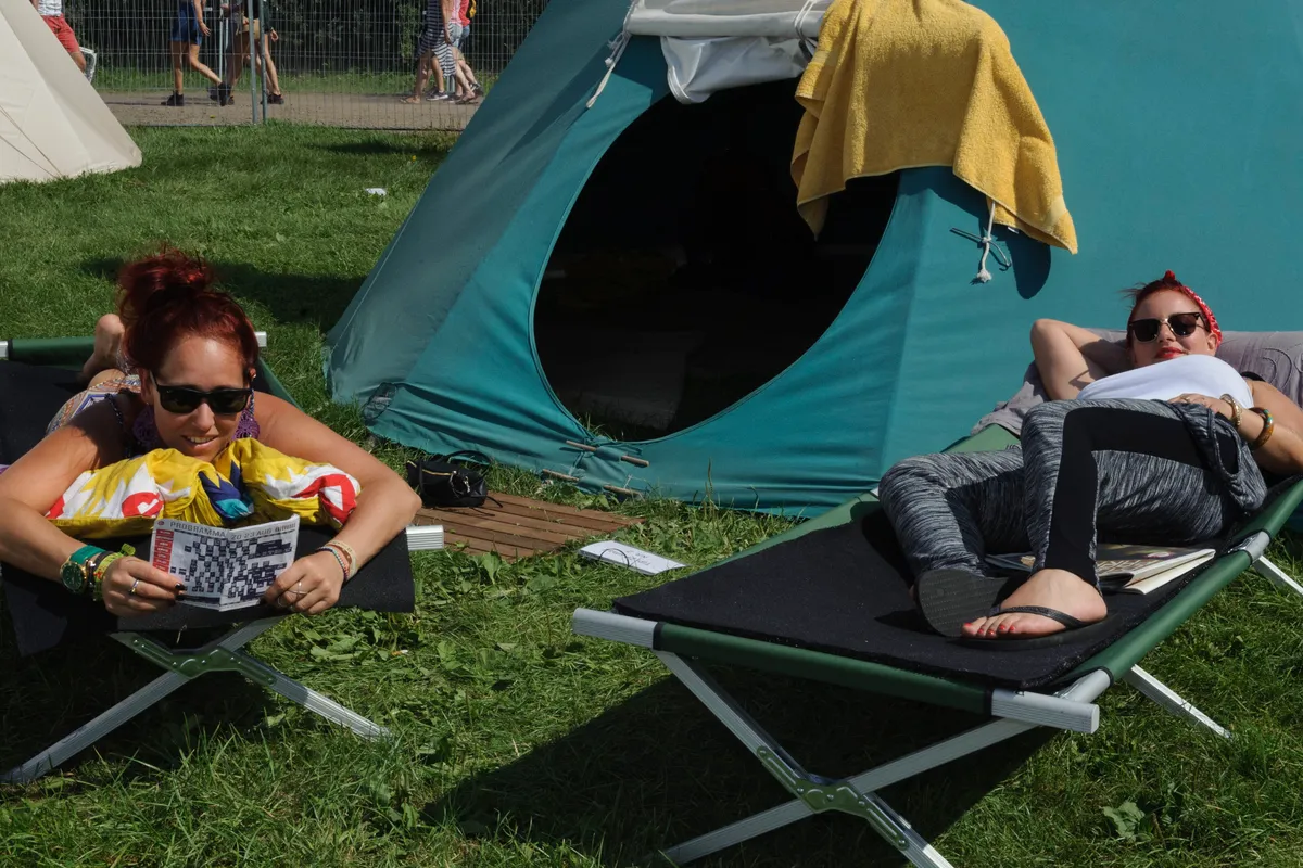 ‘Hij is zo groot dat we tegen elkaar zeiden dat je er een radslag in kan maken – dat hebben we dus ook gedaan. Het is fijn dat je hier de ruimte hebt en je nek niet breekt over de scheerlijnen. Als je hier de glampingpoort uitstapt en naar de vieze douches loopt, kom je in een heel andere wereld – ook enig, maar niets voor mij. We vinden het wel jammer dat je hier geen eigen toiletten hebt: we hebben via via te horen gekregen dat de organisatie het wel van plan was, maar dat door de tegenvallende ticketverkoop zoveel geld is verloren dat het niet meer geregeld kon worden. Vannacht heb ik dus maar in een bekertje geplast en het zo, woesh, de tent uitgegooid.’