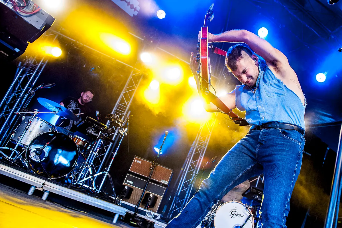 Binnen één minuut een kolkende pit, binnen twee nat van het rondvliegende bier en binnen drie de eerste crowdsurfer: in de kleinste tent van Lowlands is het zweten vandaag, zo bewijst Brits punkrockduo Slaves al halverwege de middag. De twee belandden in de BBC Sound of 2015-longlist, gingen viral met een cover van grime-anthem 'Shutdown' en brachten begin deze zomer debuutalbum Are You Satisfied? uit. En dat met een minimale bezetting: een drumstel zonder bassdrum, een enkele gitaar en rechtlijnige punkrockliedjes. Maar meer is er ook niet nodig om de Charlie op z’n kop te zetten. ‘If you live your life like an animal, you shall die like an animal,’ spuwt de drummer/zanger de tent in, tussendoor steekt hij zijn tong viezig uit de mond en halverwege belandt hij al crowdsurfend in het midden van het publiek. De twee lullen meer dan ze spelen en de liedjes zijn wel érg simplistisch, maar daar bluft Slaves zich doorheen met plat-Britse branie en de versterker op 11. (Timo Pisart)