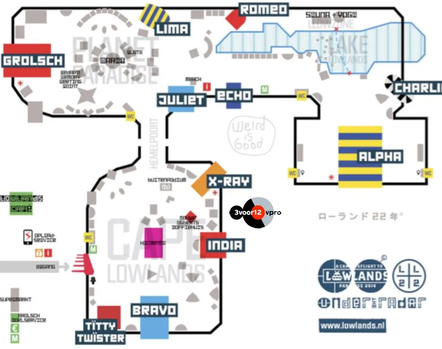 "Ja, dan doel ik op een ander deel van het festivalterrein. Het afgelopen jaar heb je al gemerkt dat Cape Lowlands behoorlijk op de schop ging, met de Bravo en India op een andere plek en de horeca elders. We hebben dat hele gebied aangepakt, omdat we zagen dat in vergelijking met Planet Paradise (waar mensen graag hangen en zitten) Cape Lowlands een beetje achter bleef. Het was wat ongezellig door de indeling. Dat hebben we aangepast en dat bleek bijzonder goed te werken. Daardoor zagen we weer dat Planet ook wel een opfrisbeurt kan gebruiken, dus die gooien we dit jaar op de schop. Alleen de Grolsch blijft staan, dat moet wel in verband met geluid."