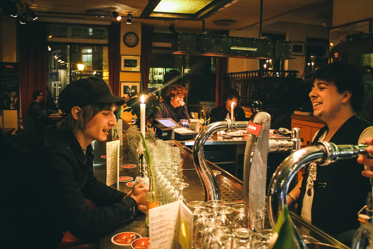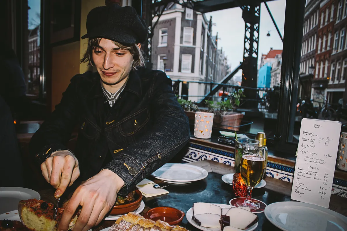 Iets na zevenen wandelt Meser zijn favoriete Spaanse restaurant Duende Dos binnen met zijn jeugdvriend en gitarist Isaac Wadsworth. Die verhuisde twee jaar geleden ook naar Amsterdam om mee te kunnen spelen in de nieuwe band van Meser. “Het eten is hier écht goed,” beamen de twee fijnproevers met verstand van zaken. “Spaans eten zoals het hoort. We dineren eigenlijk nooit buiten de deur. Behalve op zondag. Dan maken ze hier onbeperkt paella.”