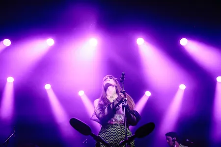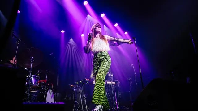Het is een ontzettend onderhoudende, leuke show van de polder-popster: Merol zwiert over het podium in pluizige top, op koeienprint-hakken en met stijlvolle handschoenen, met als geheime wapen natuurlijk die windmachine voor haar voeten. In haar set balanceert ze het allerliefst op die dunne lijn tussen glamoureus en kneuterig, sexy en awkward. In ‘Dan Maar Jij’ bijvoorbeeld is het tegen sluitingstijd, en wil ze zo graag van die pandapunten af dat ze toch maar met dat sneue figuur (‘hooguit een zesje’) mee naar huis gaat. En ‘foefsafari’, nog zo’n nummer. Dat woord klinkt niet zozeer sensueel, eerder FUN: als een jaren negentig bordspelletje met net iets te veel felgekleurd plastic.