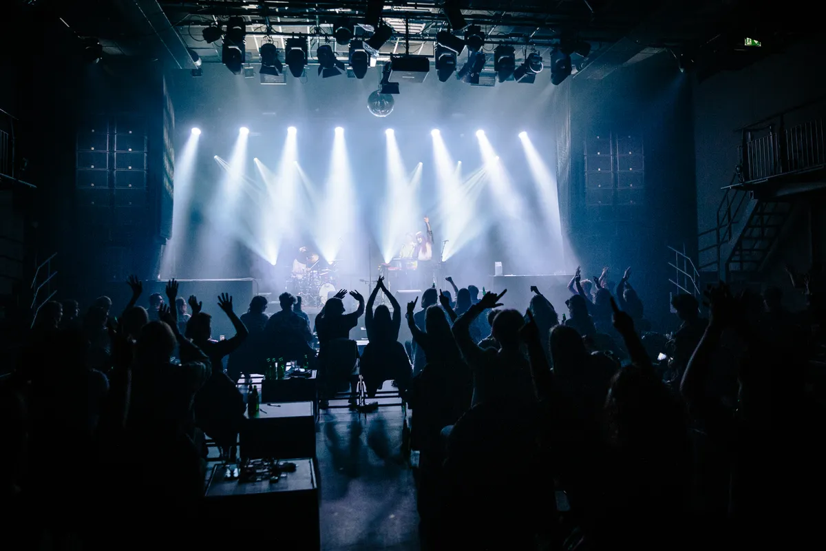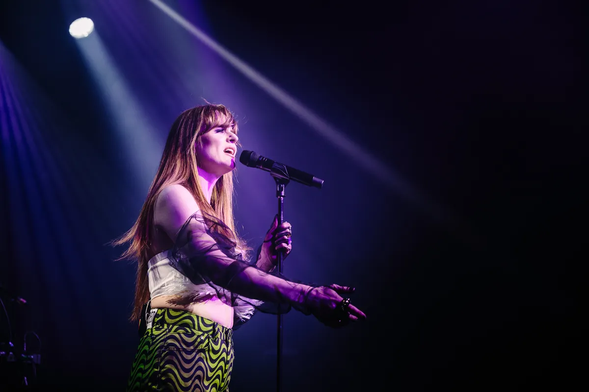 ‘Backstage kun je altijd al voelen wat voor publiek er in de zaal zit. En vandaag voelde ik dat jullie een beetje…. negatief zijn.’ Stilte. Merol kijkt veelbetekenend de Melkweg in, met een dikke smile. Zo van: snap je ‘m? Een enkeling gniffelt, verder blijft het stil. Ze probeert nog eens: ‘Omdat jullie allemaal negatief getest zijn?’ Het is de eerste van de vele vrolijke grapjes die de zangeres maakt tijdens haar uurdurende pilot-show. Iedereen is getest, maar de 1,5 meter blijft heilig en dansen en meeschreeuwen zijn verboden. Dus tijdens de meezingbreak van ‘Hou Je Bek En Bef Me’: ‘Jullie mogen niet zingen… maar neuriën is wel oké, hè?’ En er staat een grote vissenkom vol boodschappenbriefjes die het publiek kon achterlaten. ‘Als dit dan toch een theatershow wordt, dan moet ik wel wat te vertellen hebben. En daar heb ik dus helemaal geen zin in. Nu kan ik jullie verhalen vertellen.’