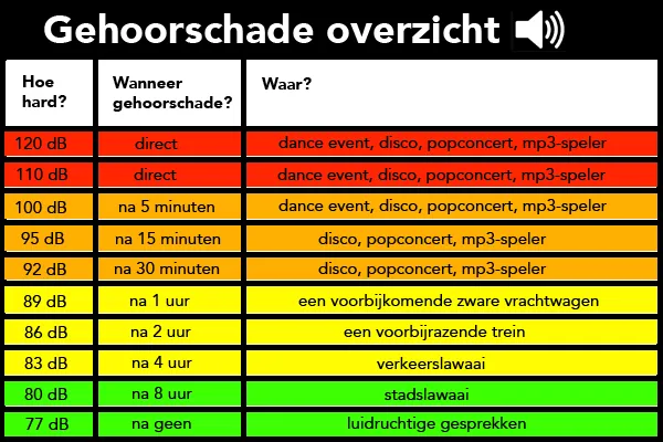 Ongeveer een kwart van de jongeren heeft door harde muziek een gehoorbeschadiging opgelopen, blijkt uit onderzoek van het AMC in Amsterdam. Onder frequente festival- en clubbezoekers is dit percentage waarschijnlijk nog hoger en onder professionele musici wordt het aandeel geschat op 75 procent. Hoe het met jouw gehoor gesteld is kun je hier testen.